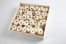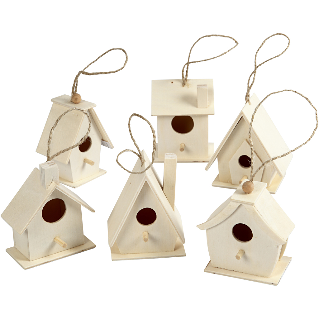 Mini birdhouse in wood with string for hanging,. 6 different designs each of 10 pcs, Supplied in a wooden display box (size 37x37x10,5 cm). Bird House, H: 7 cm, 6x10 pc/ 1 pack