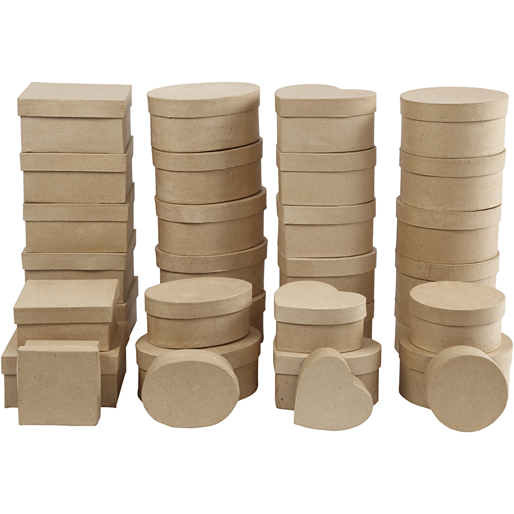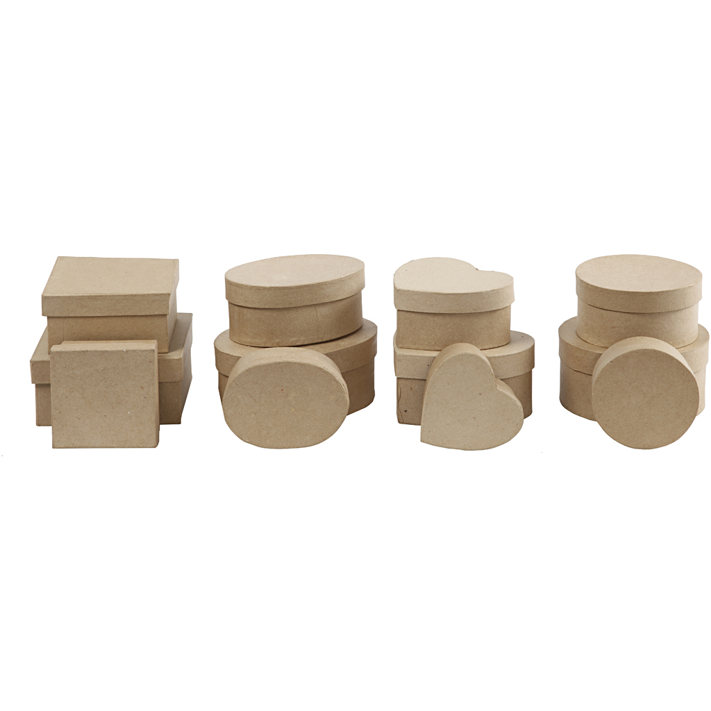 An assortment of hand-made papier-mâché boxes in 4 different shapes and sizes. Contents: 18 oval boxes, 18 round boxes 18 squares, 18 heart-shaped boxes. Boxes, H: 5-7,5 cm, dia. 10-18 cm, 72 pc/ 1 box