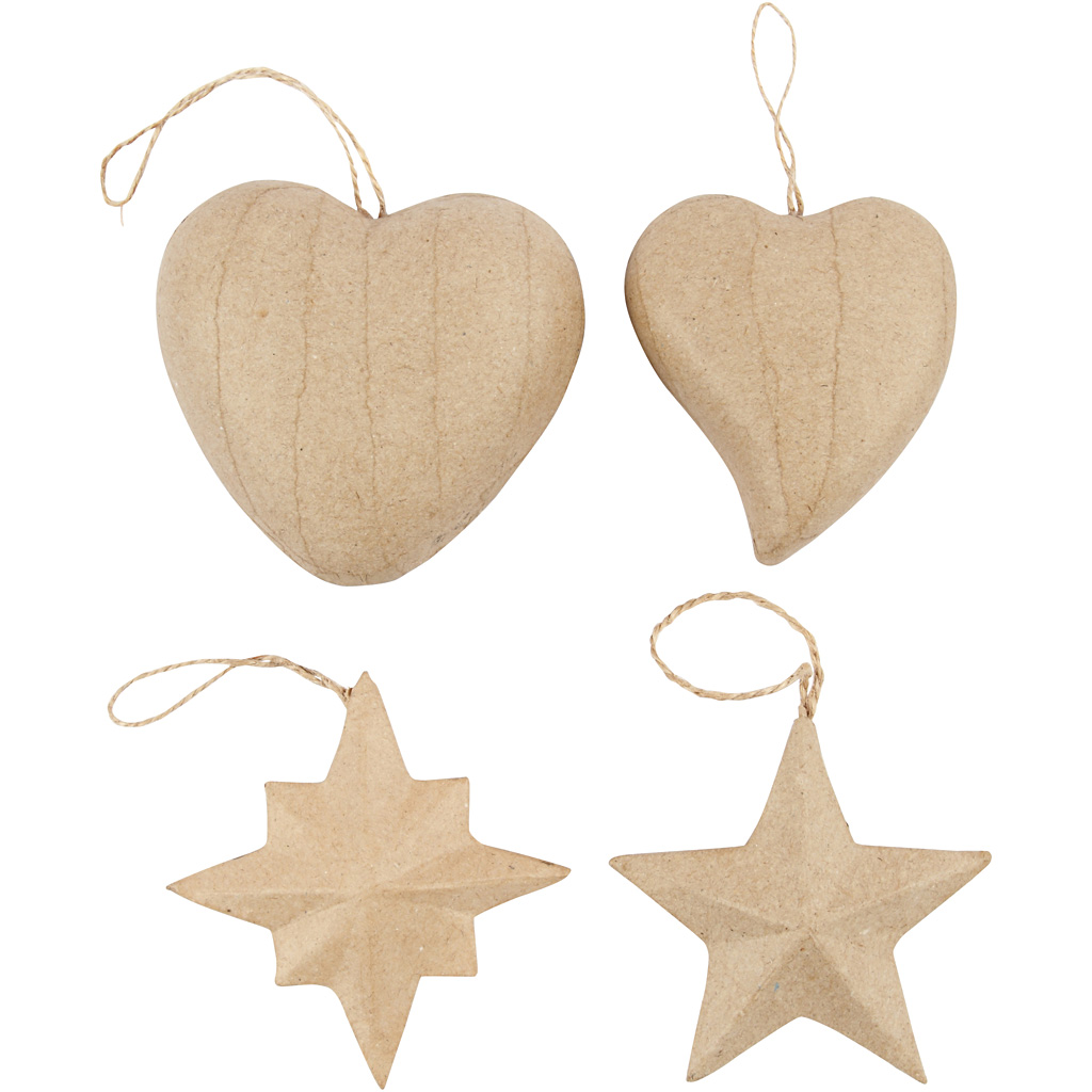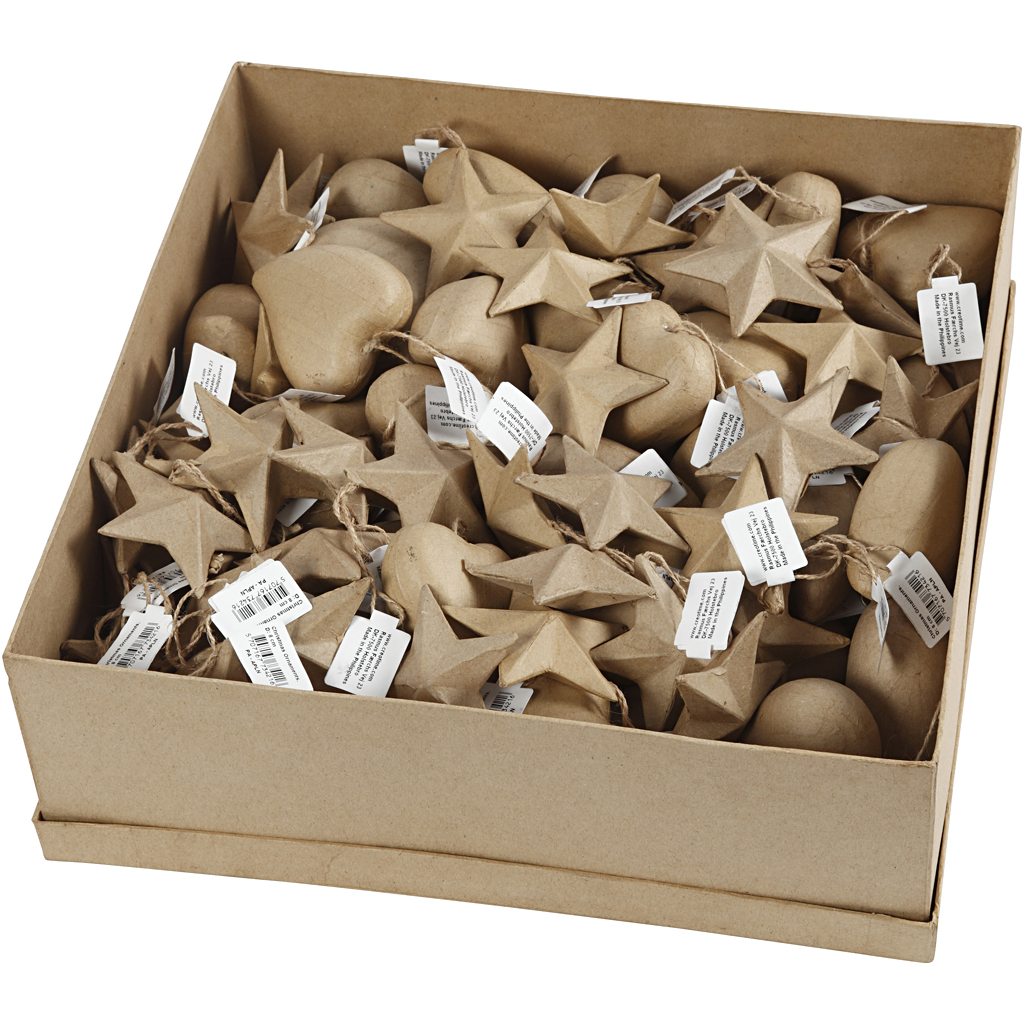 An assortment of handmade papier-mâché stars and hearts with an inner core of plastic to ensure stability and jute string for hanging Pack with 3 different designs. Supplied in a large papier-mâché box size 37 x 37 x 12cm. Christmas Ornaments, dia. 8 cm, 80 pc/ 1 pack