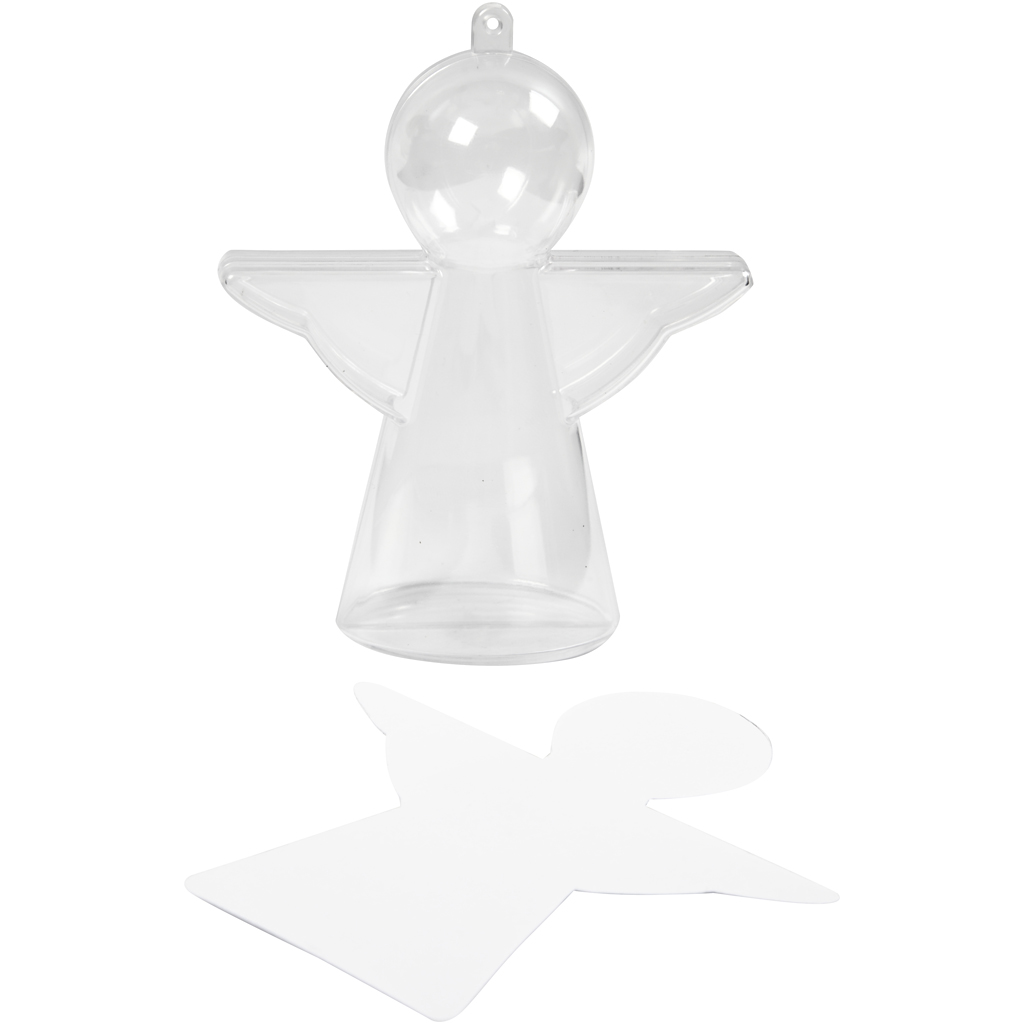Two-part suspension of clear plastic in the shape of an angel to fill with ornaments and collectables. Loosely carton posts included to decorate and paste. Decoration Angel, transparent, H: 10 cm, 4 pc/ 1 pack