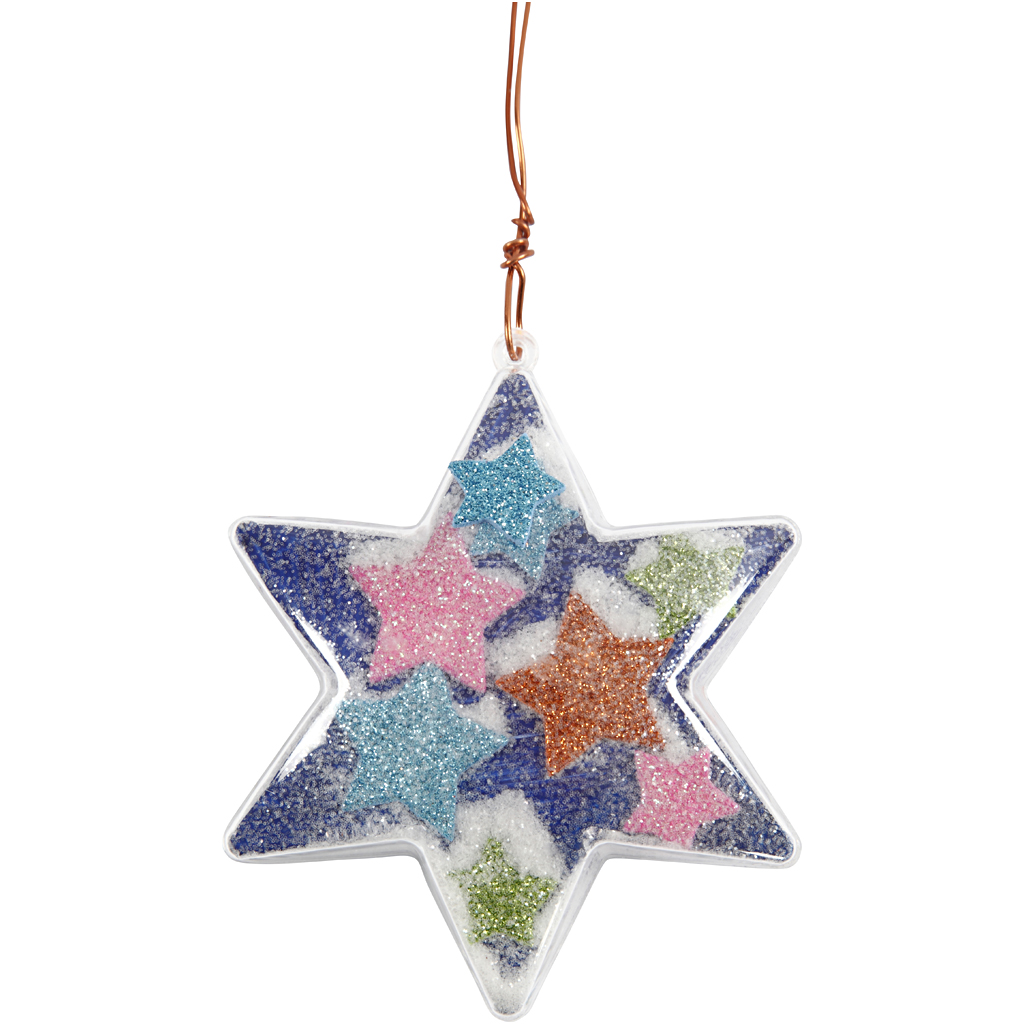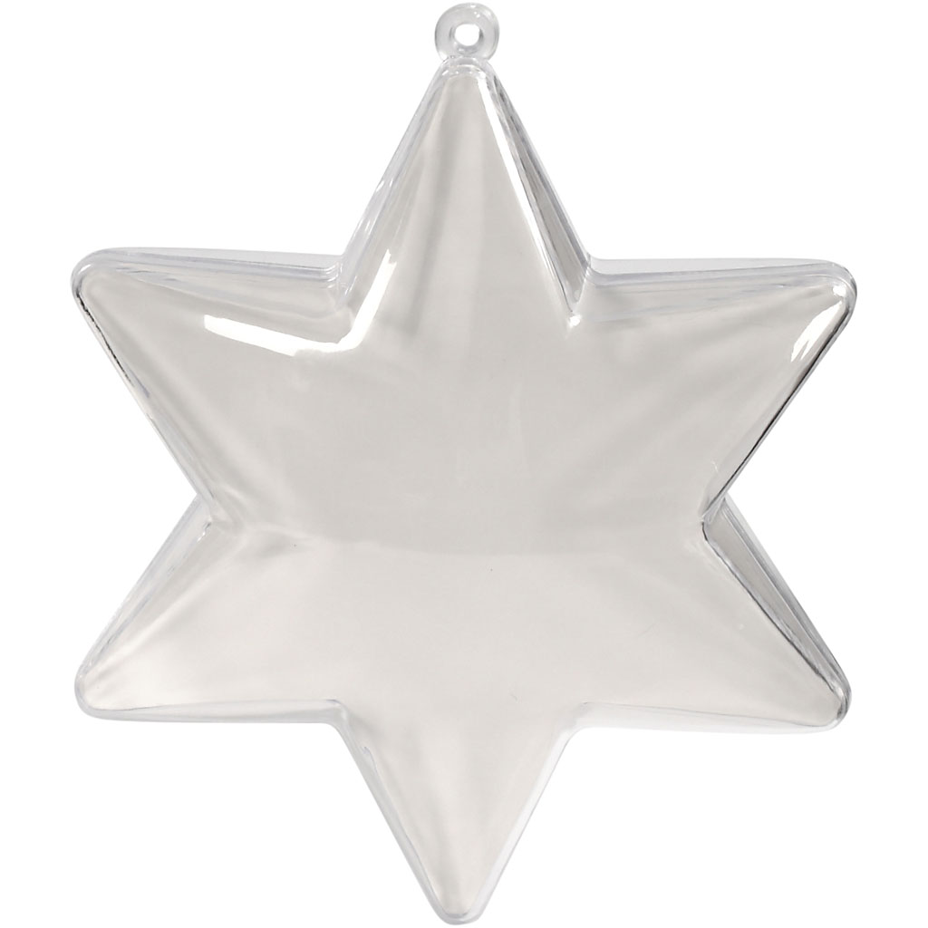 Two-part suspension of clear plastic in the form of a six-pointed star to stand, fill with ornaments and collectables. Loosely carton posts included to decorate and paste. Decoration Star, transparent, H: 10 cm, 5 pc/ 1 pack