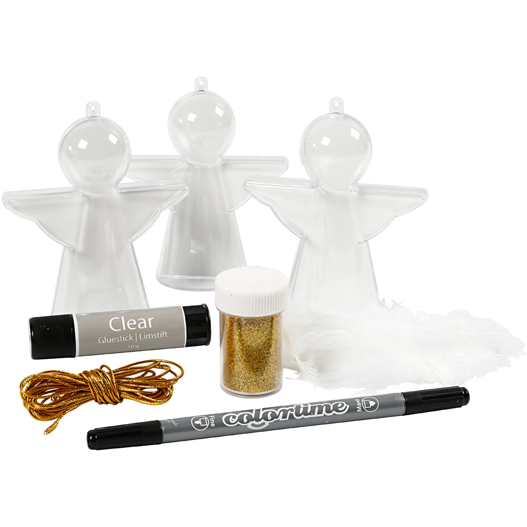 A set of 3 unique hanging decorations with all the materials needed to decorate the two-piece clear acrylic shapes. Each shape separates to receive a decorated cardboard insert. Contains: 3 angels, 6 feathers, 1 black Cololurtime Double Markers, 10g. Decorations with Interior Angels , 1 set