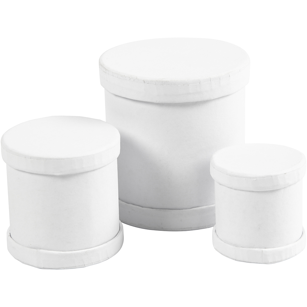 Drums of cardboard. The drums have removable lids so they can be used as boxes. Drum boxes, white, H: 4+5+7 cm, dia. 4+5+6,5 cm, 1 set