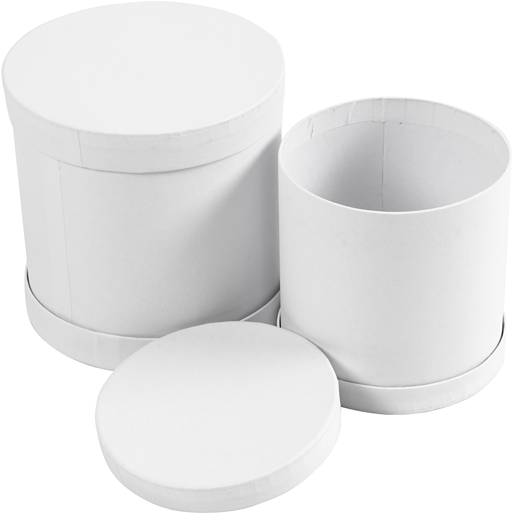 Drums of cardboard. The drums have removable lids so they can be used as boxes. Drum boxes, white, H: 11+13 cm, 1 set