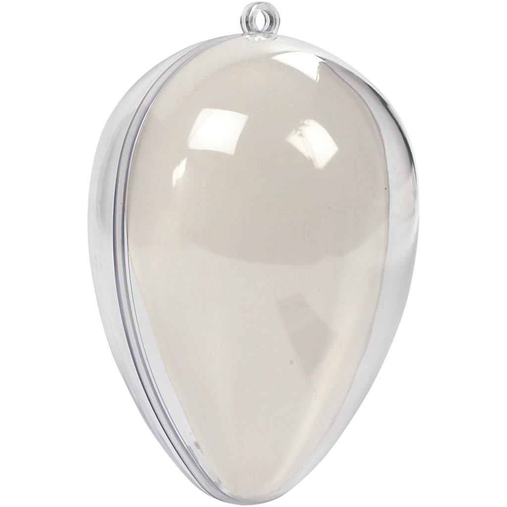 Two-part hanging plastic egg-shaped bauble to decorate with paint or fill with ornaments and collectables. Loose cardboard posts included to decorate and paste. Egg-Shaped Baubles to Decorate, H: 9 cm, 5 set/ 1 pack