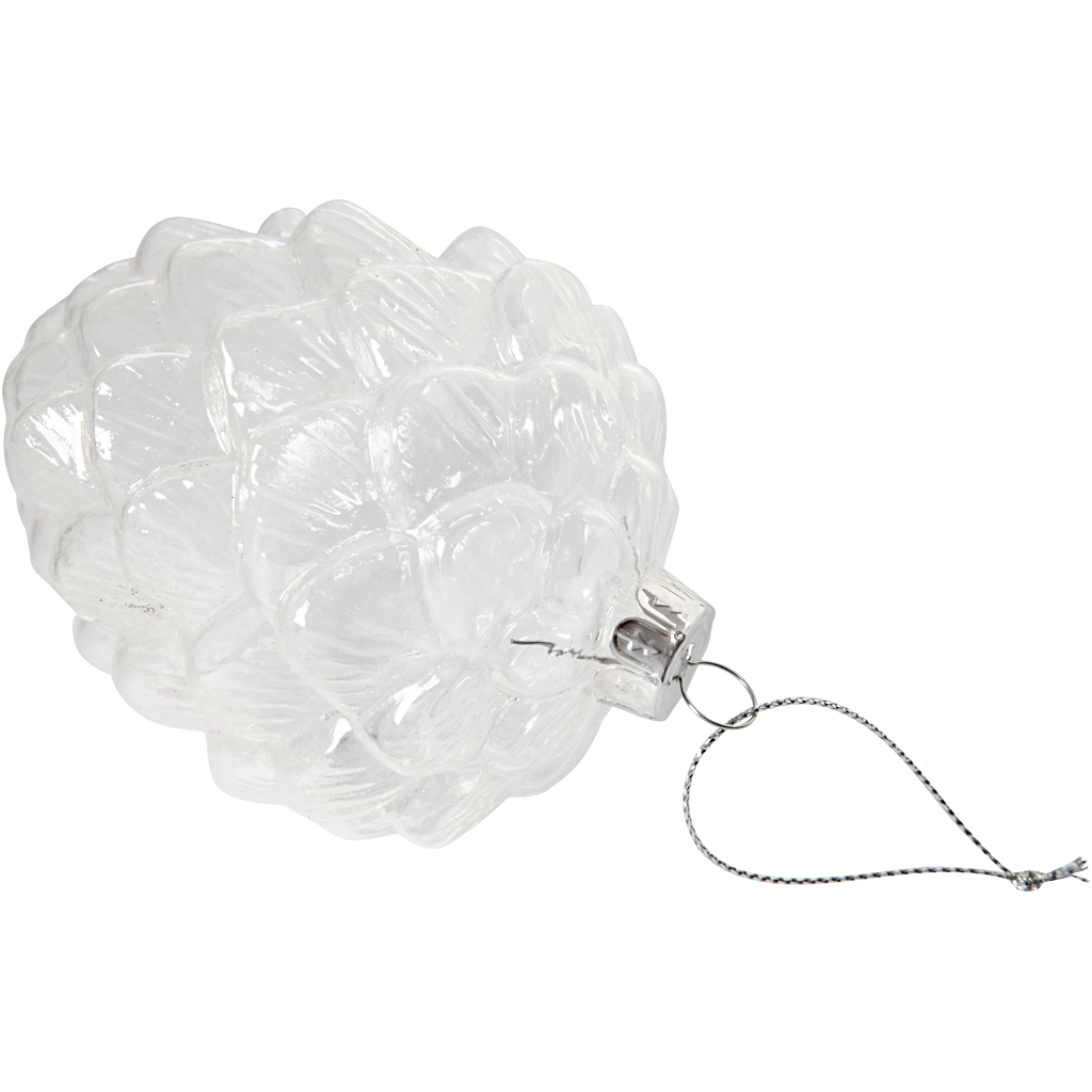 Hanging ornament of clear glass in 2 designs. Each ornament has a removable, silver metal collar with eyelet for hanging. A set of 4 ornaments (2 in 2 different designs) in a black box with a clear plastic lid. Glass Ornaments, transparent, H: 9,5+10,5 cm, dia. 5,5+7,5 cm, 4 pc/ 1 pack