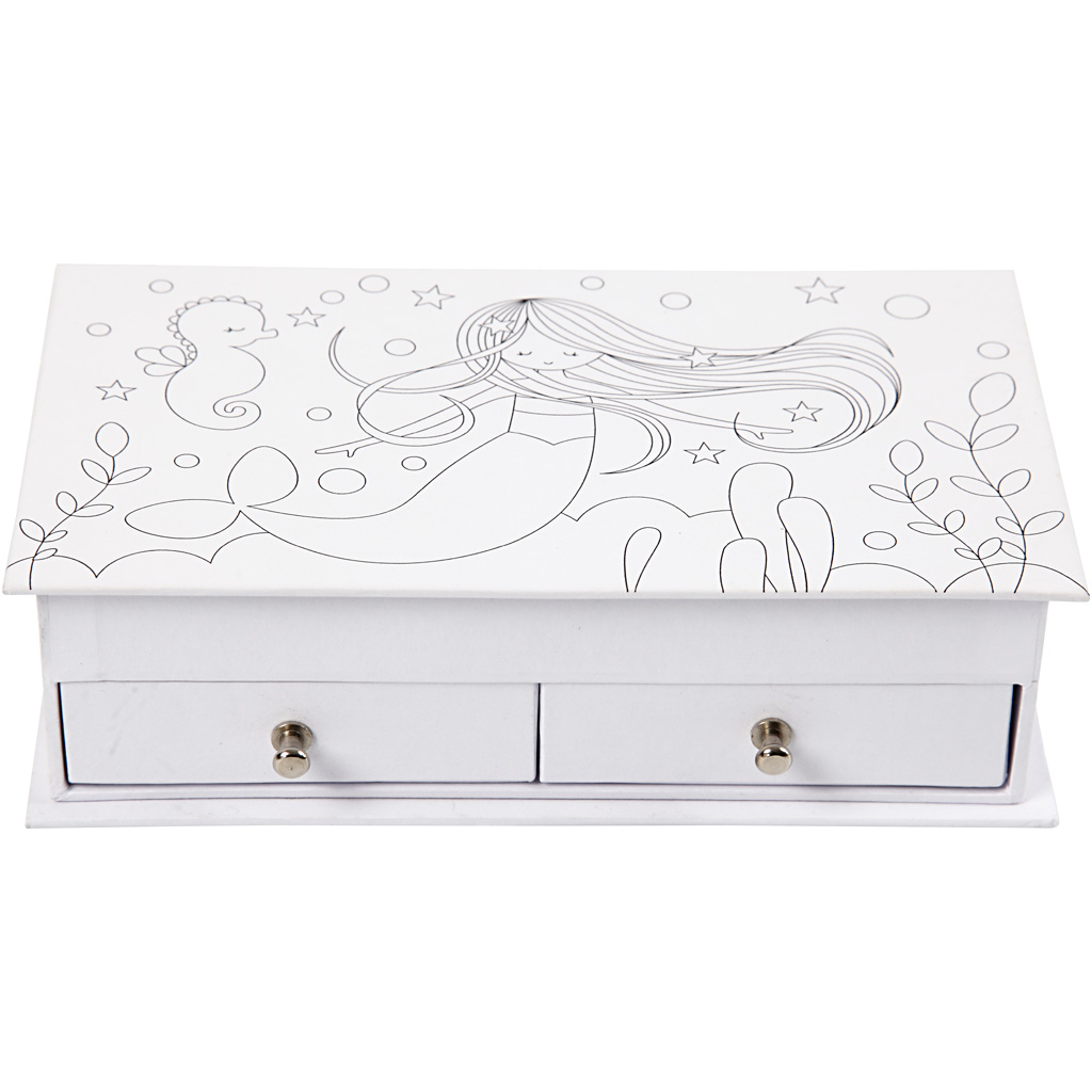 Jewellery box of cardboard with a printed mermaid on the lid. The box consists of 2 drawers at the bottom, 6 compartments at the top and the mirror on the back of the lid. Jewellery Box, white, size 18x10,5 cm, H: 5 cm, 1 pc