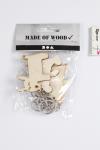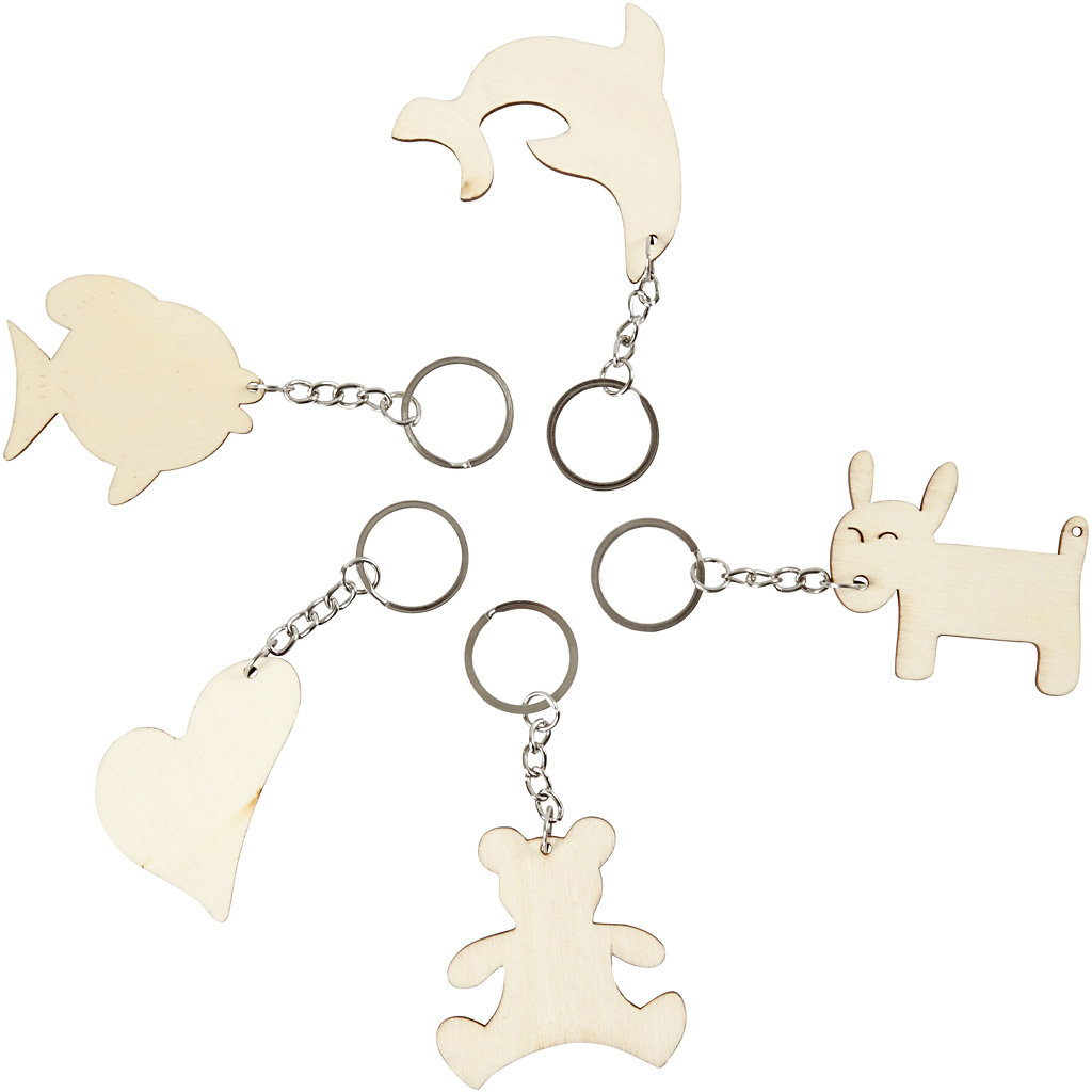 Key rings with a wooden pendants made from light wood with dark edges. Set of five pendants, dolphin, fish, dog, teddy and heart. Key Hangers with wood pendants, size 5,5x5,5 cm, thickness 2 mm, 5 pc/ 1 pack