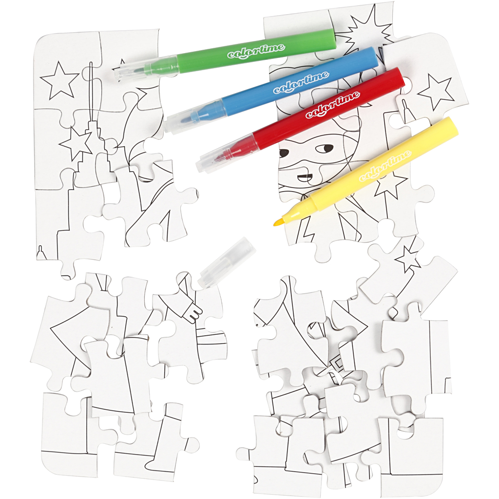 Material kit with jigsaw puzzle of cardboard with pre-printed motifs for decoration with markers. Inspiration included Content: 1 pre-printed puzzle and 4 mini markers. Mini Craft Kit, white, superhero, 1 pack