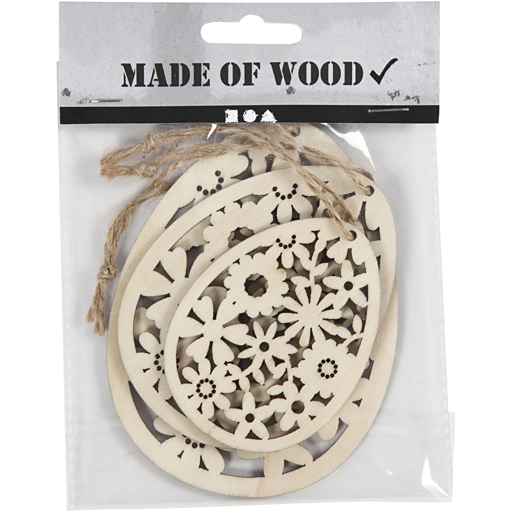Light wood suspension with dark edges. Mounted with cord for suspension. Ornaments, H: 8+10+12 cm, W: 6+7,5+9 cm, thickness 3 mm, 3 pc/ 1 pack