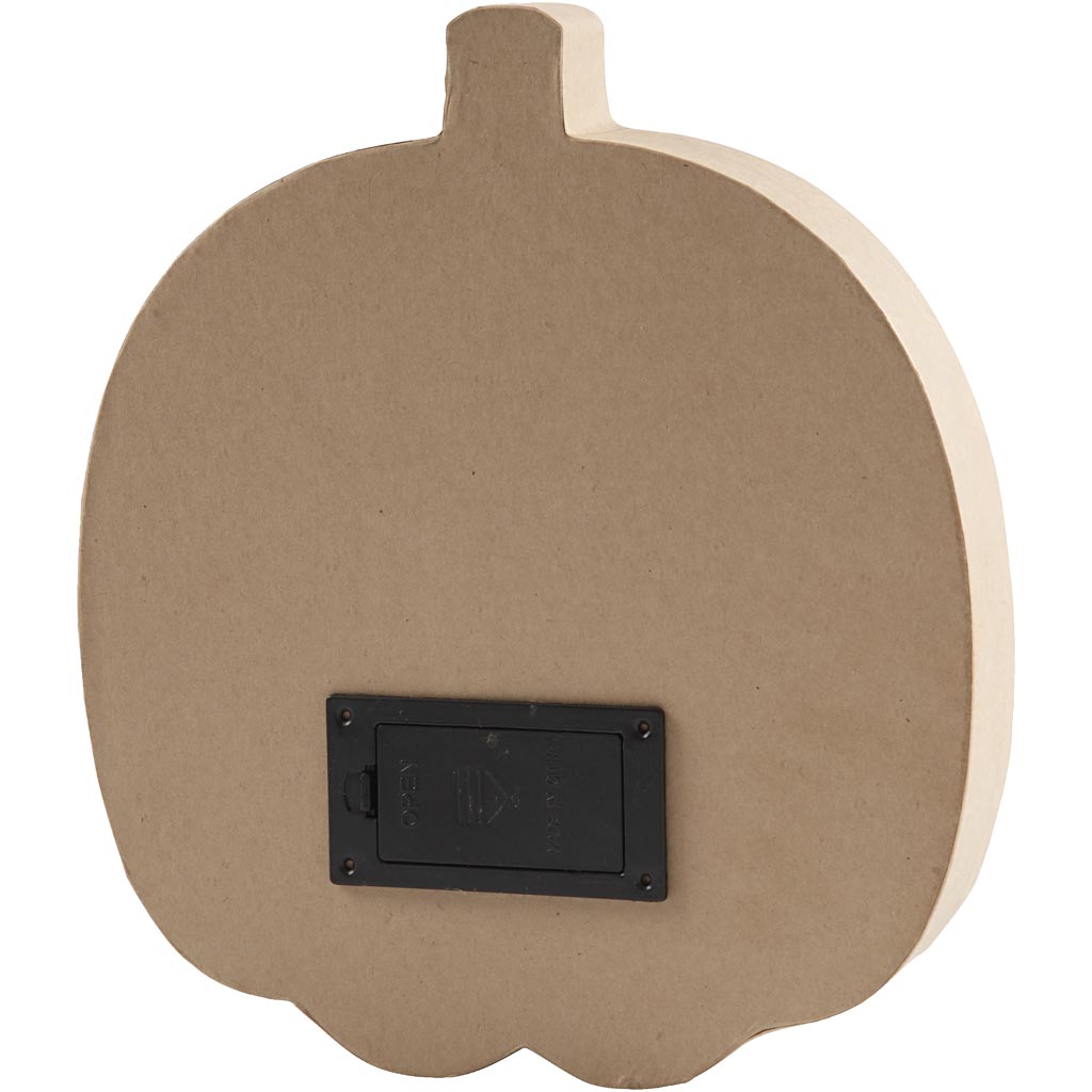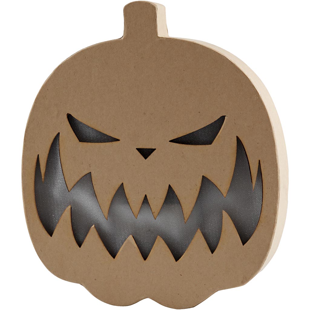 Flat pumpkin of papier-mâché with a face containing a battery-powered light. Can be free standing has built-in battery box back and a switch on the side to turn on and off Provides a warm light through cutouts covered by transparent lining. Uses 2 x. Pumpkin Light, H: 25 cm, D. 4 cm, W: 22 cm, 1 pc