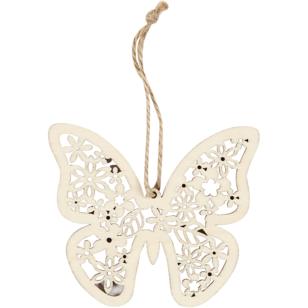 Flat suspension with fine cuts in light wood with dark edges. Supplied with suspension cord Pack with 3 different designs. Wooden Ornament, butterfly, flower and bird, H: 10 cm, 3 pc/ 1 pack
