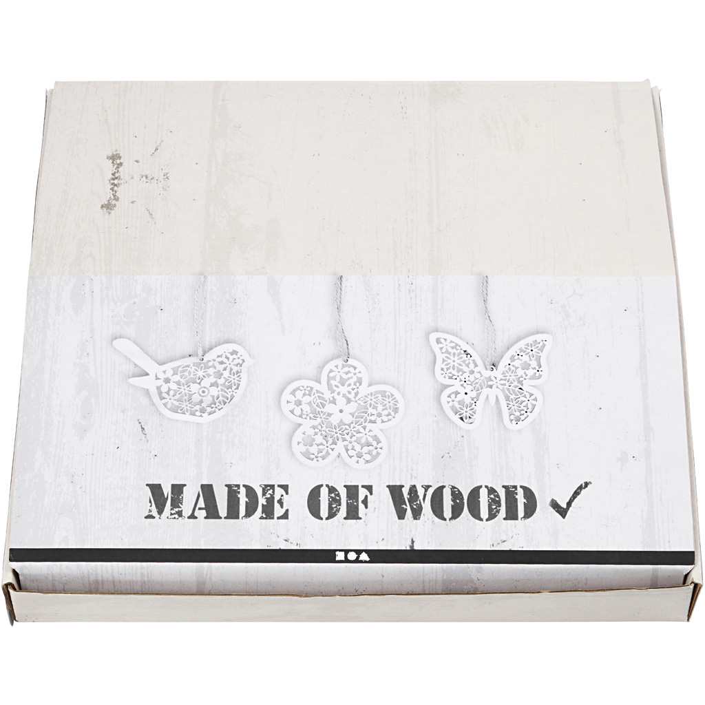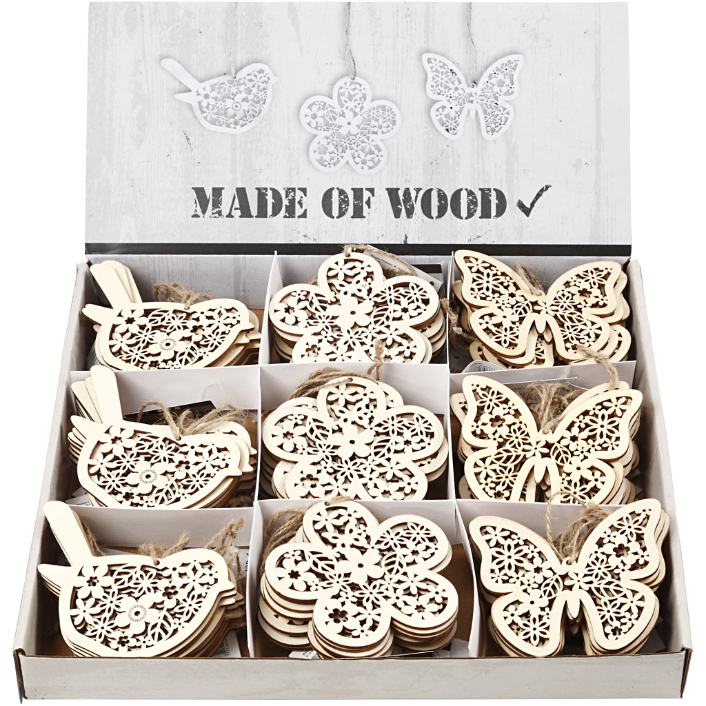 Flat suspension with fine cuts in light wood with dark edges. Supplied with suspension cord Pack with 3 different designs. Wooden Ornament, butterfly, flower and bird, H: 10 cm, 90 pc/ 1 pack