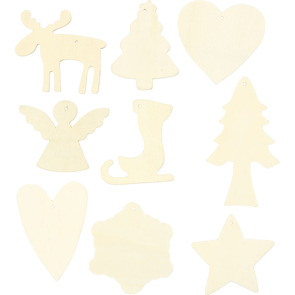 Ornament of light wood with hanging string of jute yarn and a wooden bead. Pack with 9 different designs each of 8 pcs. Wooden Ornament, christmas, size 7-8 cm, 72 pc/ 1 pack