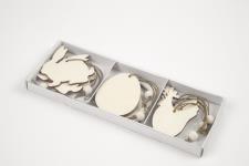 Ornament of light wood with hanging string of jute yarn and a wooden bead. Pack with 3 designs each of 3 pcs. Supplied in a plastic bag with header card. Wooden Ornament, rabbit, egg, hen, size 6 cm, thickness 3 mm, 9 pc/ 1 pack