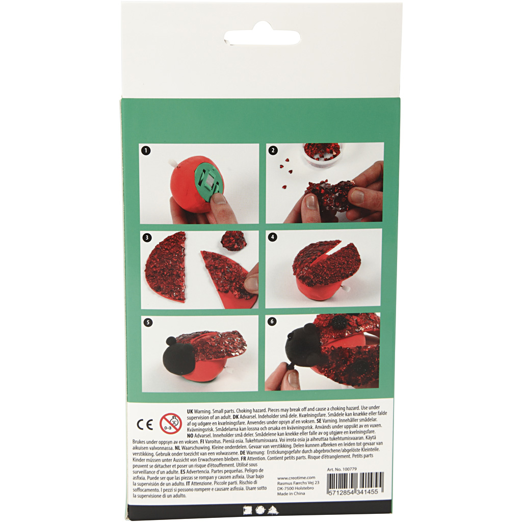 Material set for modeling a ladybug in Silk Clay with mechanical body and wings decorated with modeling base mixed with mica. Guidance included. Content: Silk Clay, mechanical body, modeling base, glitter, circles and wings in moss rubber and eyes. Lara the ladybug, 1 set