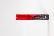 Waterproof and weather resistant ink for smooth and flat surfaces. Can be used on blackboards, glass, metal and plastic. Can be removed with a wet cloth. For cleaning a blackboard film with a slightly rough surface use an alkaline detergent with PH-v. Chalk Pen, red, line 8 mm, 1 pc