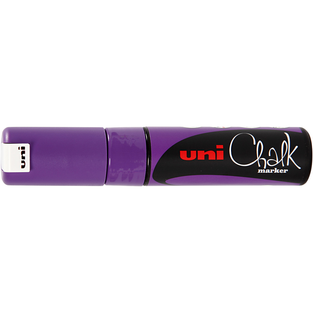 Waterproof and weather resistant ink for smooth and flat surfaces. Can be used on blackboards, glass, metal and plastic. Can be removed with a wet cloth. For cleaning a blackboard film with a slightly rough surface use an alkaline detergent with PH-v. Chalk Pen, purple, line 8 mm, 1 pc