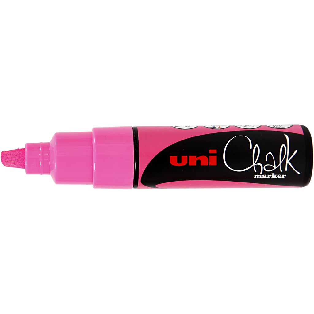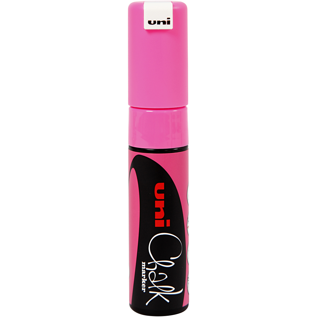 Waterproof and weather resistant ink for smooth and flat surfaces. Can be used on blackboards, glass, metal and plastic. Can be removed with a wet cloth. For cleaning a blackboard film with a slightly rough surface use an alkaline detergent with PH-v. Chalk Pen, neon pink, line 8 mm, 1 pc