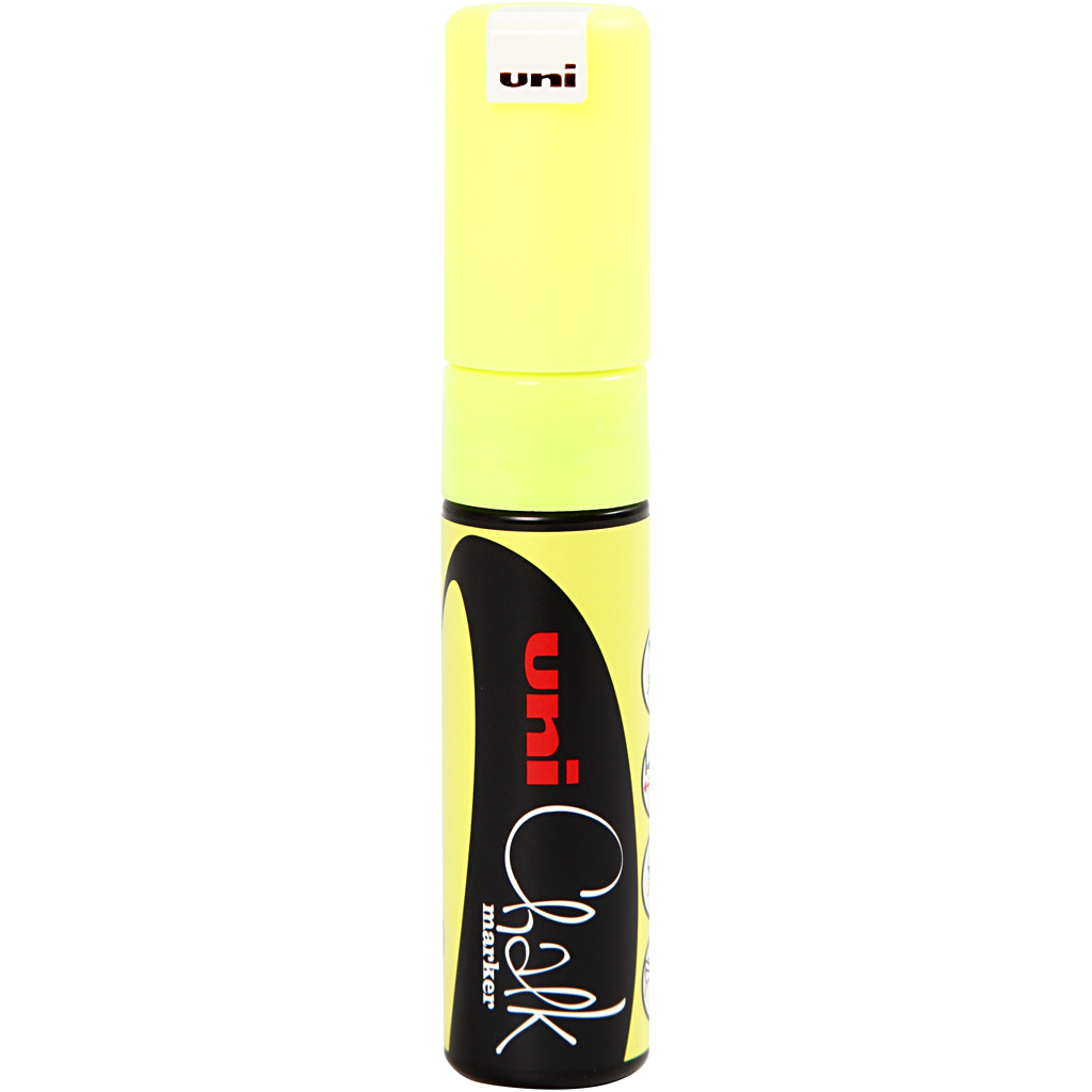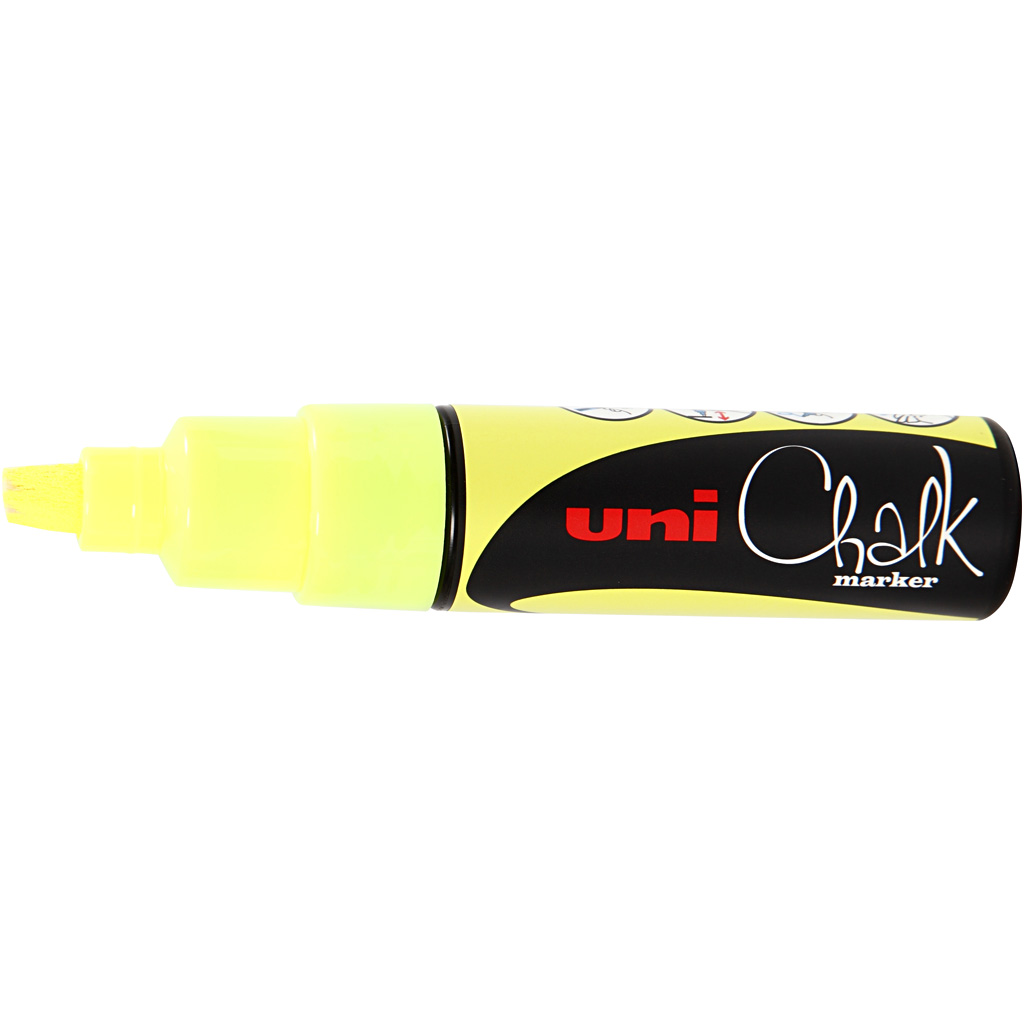 Waterproof and weather resistant ink for smooth and flat surfaces. Can be used on blackboards, glass, metal and plastic. Can be removed with a wet cloth. For cleaning a blackboard film with a slightly rough surface use an alkaline detergent with PH-v. Chalk Pen, neon yellow, line 8 mm, 1 pc