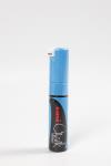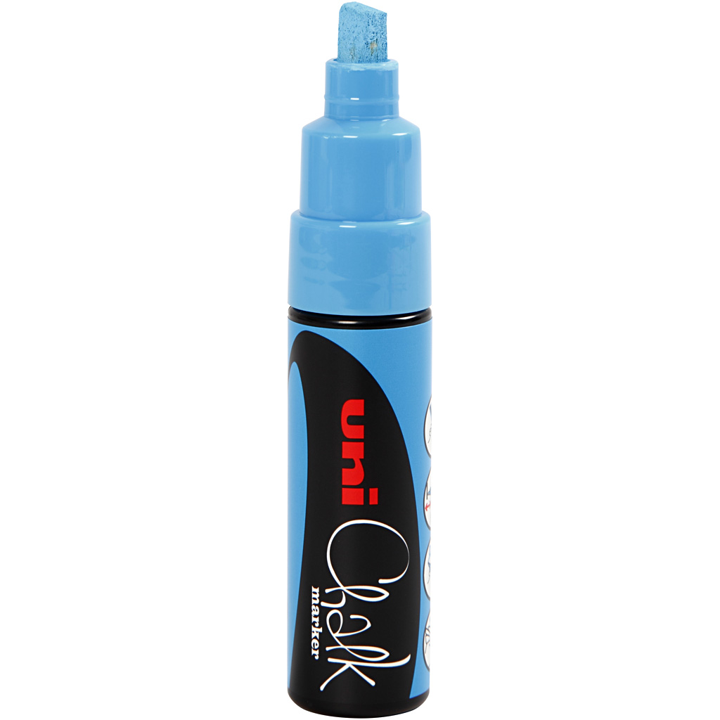 Waterproof and weather resistant ink for smooth and flat surfaces. Can be used on blackboards, glass, metal and plastic. Can be removed with a wet cloth. For cleaning a blackboard film with a slightly rough surface use an alkaline detergent with PH-v. Chalk Pen, light blue, line 8 mm, 1 pc