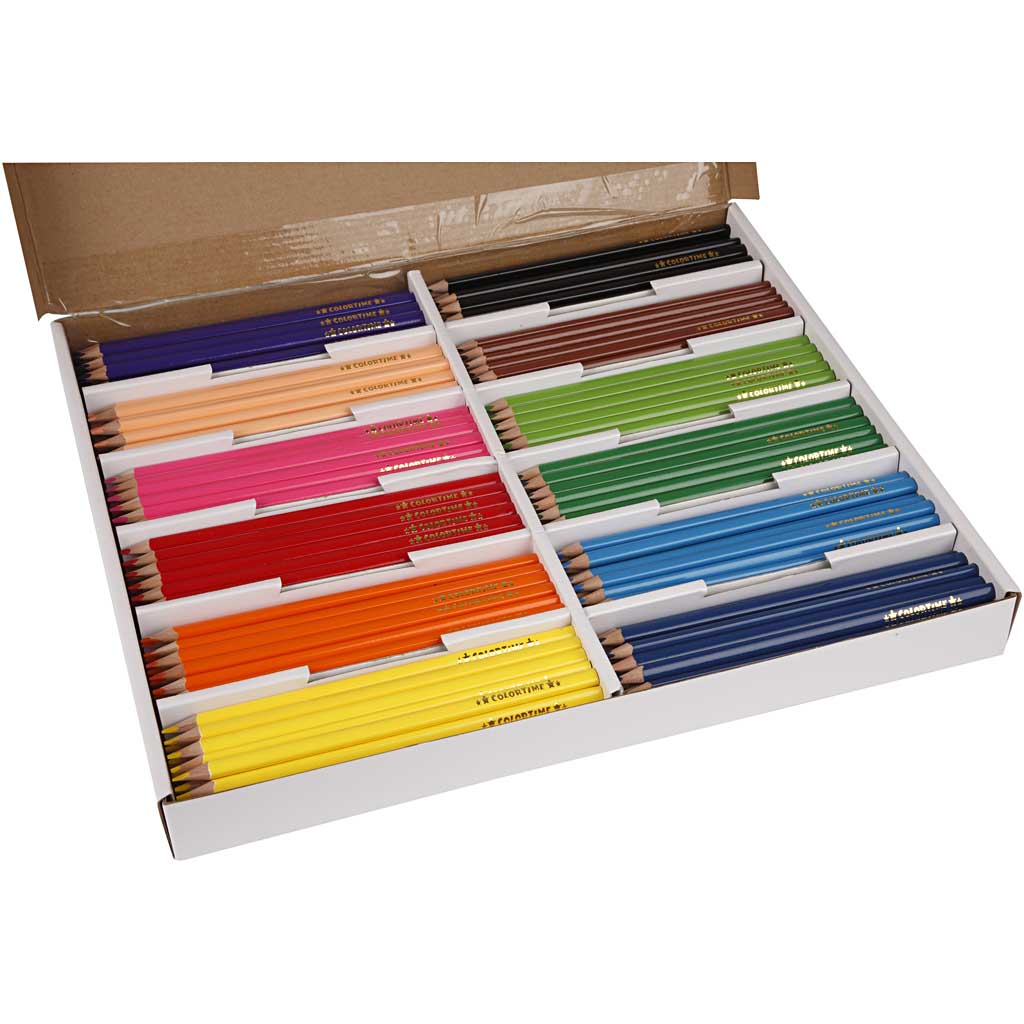 Premium quality, triangular shaped coloured pencils with bonded lead. Supplied in a storage box with 12 colours each of 24 pcs. Colortime Colouring Pencils, assorted colours, L: 17,45 cm, lead 3 mm, 12x24 pc/ 1 pack