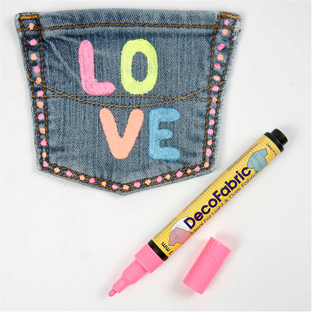 Textile Ink Pens are beautiful, in bright neon colours which can also be used on dark fabrics. Washable at 30 °C after fixing with an iron. Deco Textile Markers, neon colours, line 3 mm, 6 pc/ 1 pack