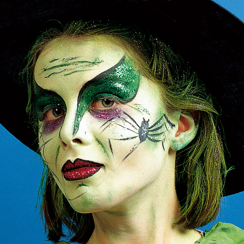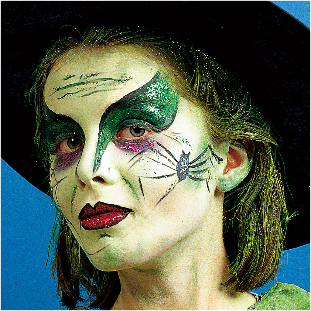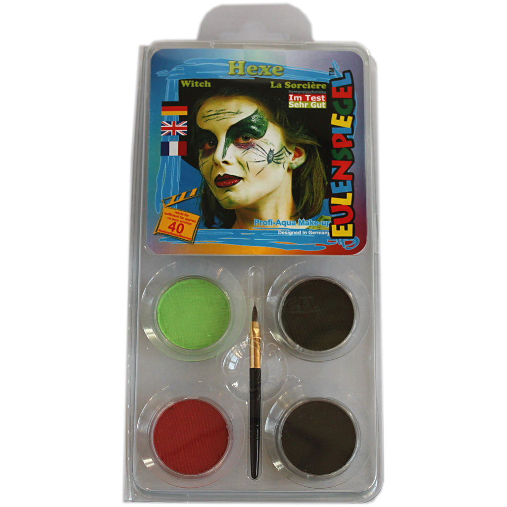Starter kit with water-based quality makeup from Eulenspiegel. Colours may be mixed, applied with a brush or sponge and washed off with soap and water. Make-up for about 40 faces. Content: 4 Colours each of 3,5 ml, 1 pc. brush and guidance. Eulenspiegel Face Paint - Motif Set, assorted colours, witch, 1 set