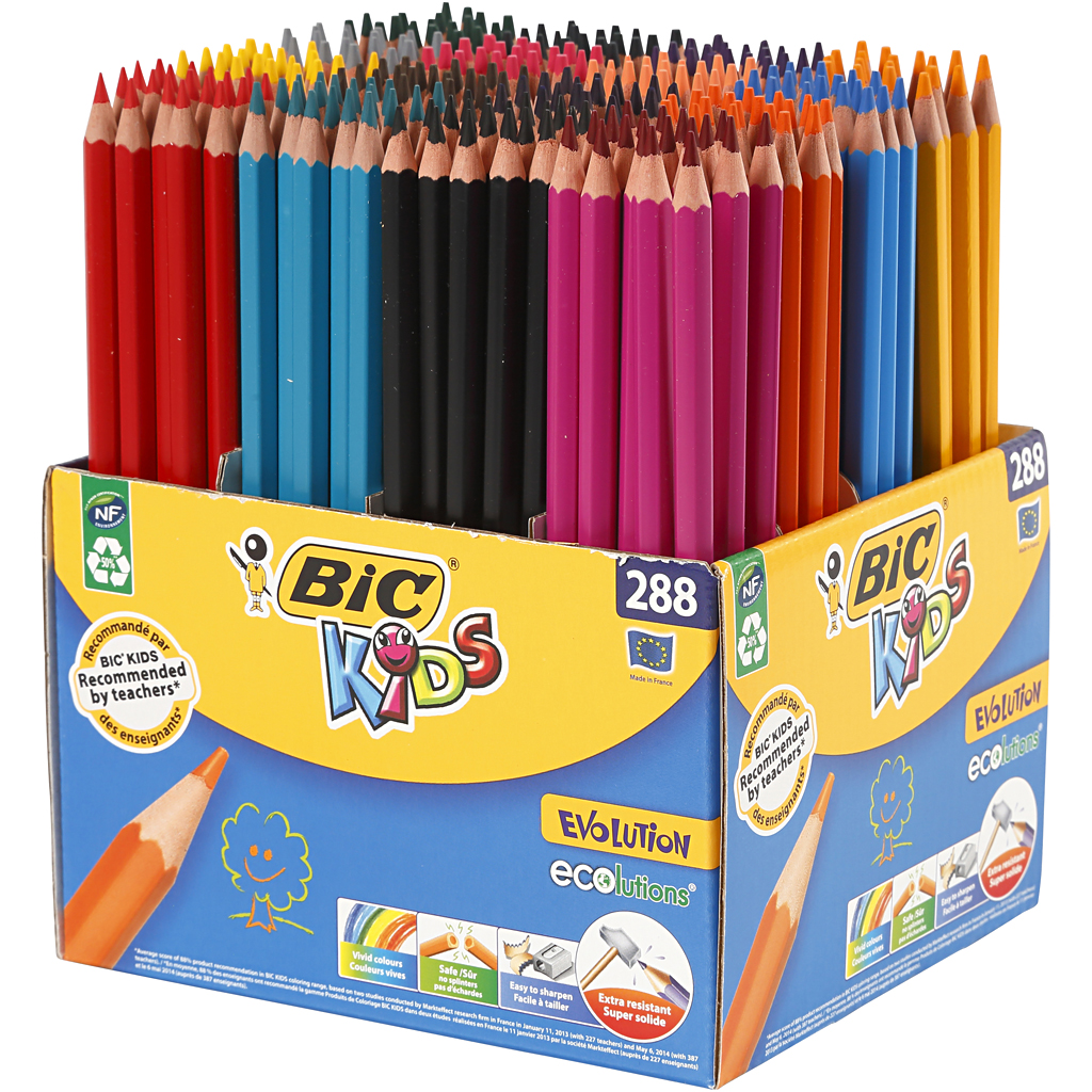 BIC Kids hexagonal wood-free colouring pencils with ultra resistant lead. Environmentally friendly with at least 50% recycled material, slightly bent / kinked safe. Pack with 16 colours each of 18 pcs. Supplied in a practical box. Evolution Colour Pencils, assorted colours, L: 17,5 cm, lead 3 mm, 288 pc/ 1 pack