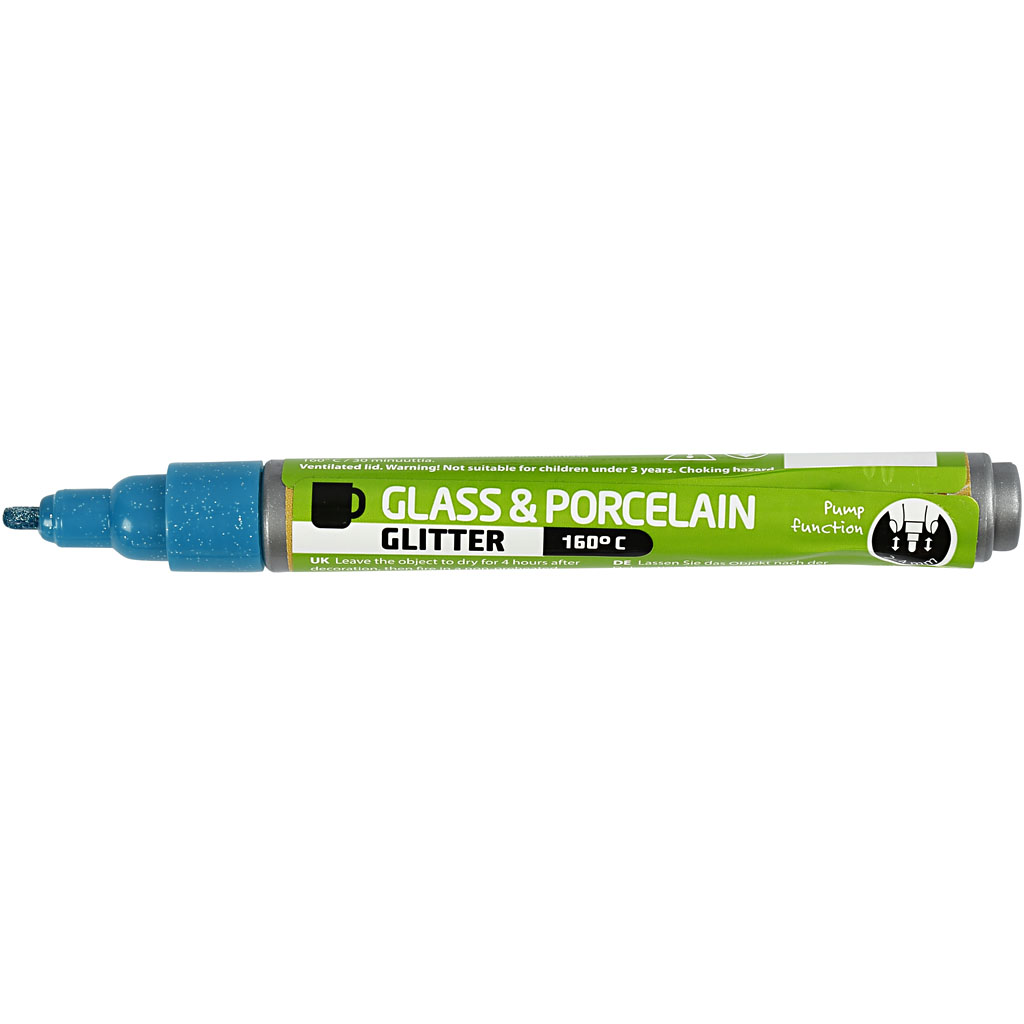 Semi-transparent, water based glass and Porcelain marker with glitter for both glass, metal and porcelain. After a drying time of 4 hours, cure at 160 C in a non-preheated kitchen oven for 30 minutes. Dishwasher safe. Glass & Porcelain Marker, turquoise, glitter, line 2-4 mm, semi opaque, 1 pc