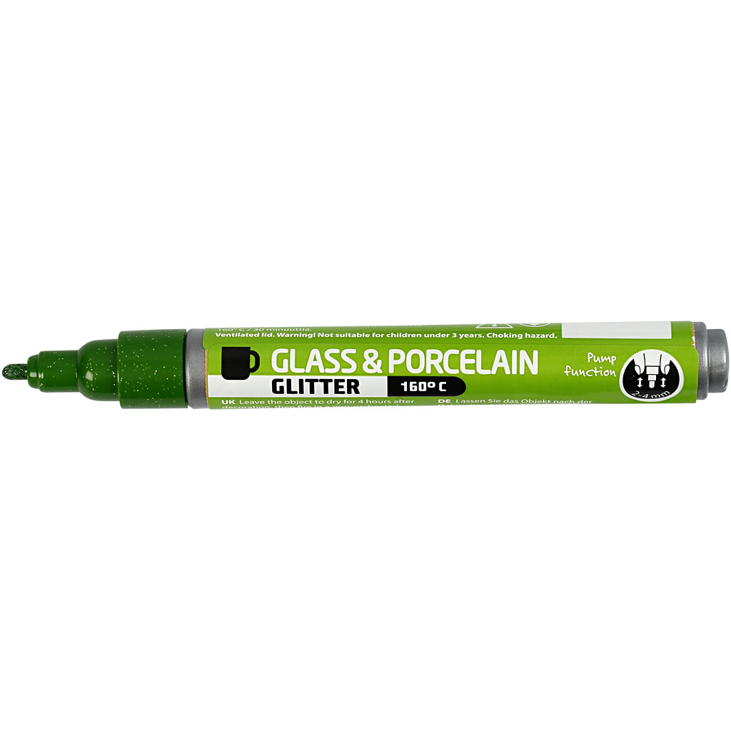 Semi-transparent, water based glass and Porcelain marker with glitter for both glass, metal and porcelain. After a drying time of 4 hours, cure at 160 C in a non-preheated kitchen oven for 30 minutes. Dishwasher safe. Glass & Porcelain Marker, light green, glitter, line 2-4 mm, semi opaque, 1 pc