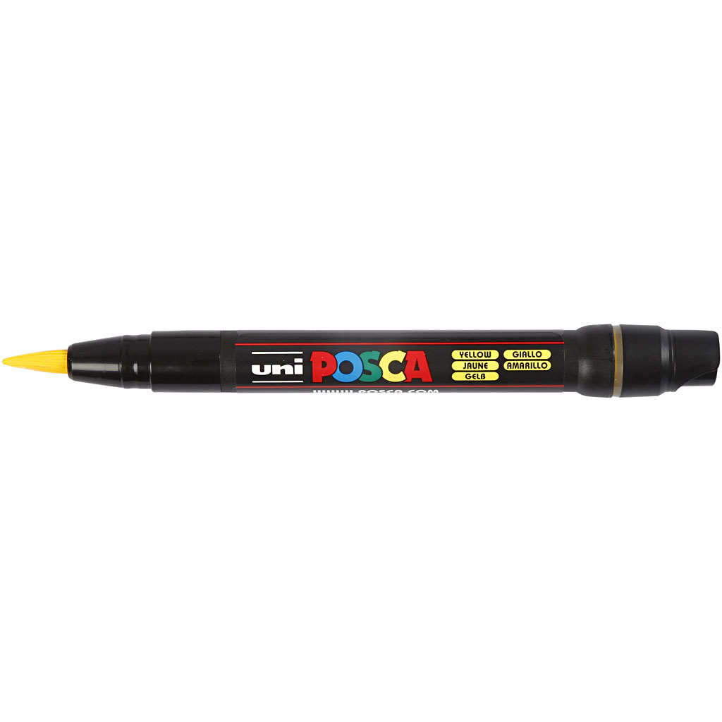 Water-based, opaque and permanent marker for both smooth and porous surfaces - eg. glass, metal, textile, plastics, etc. The special soft tip draws and writes like a brush. Posca Marker, yellow, line 1-10 mm, 1 pc