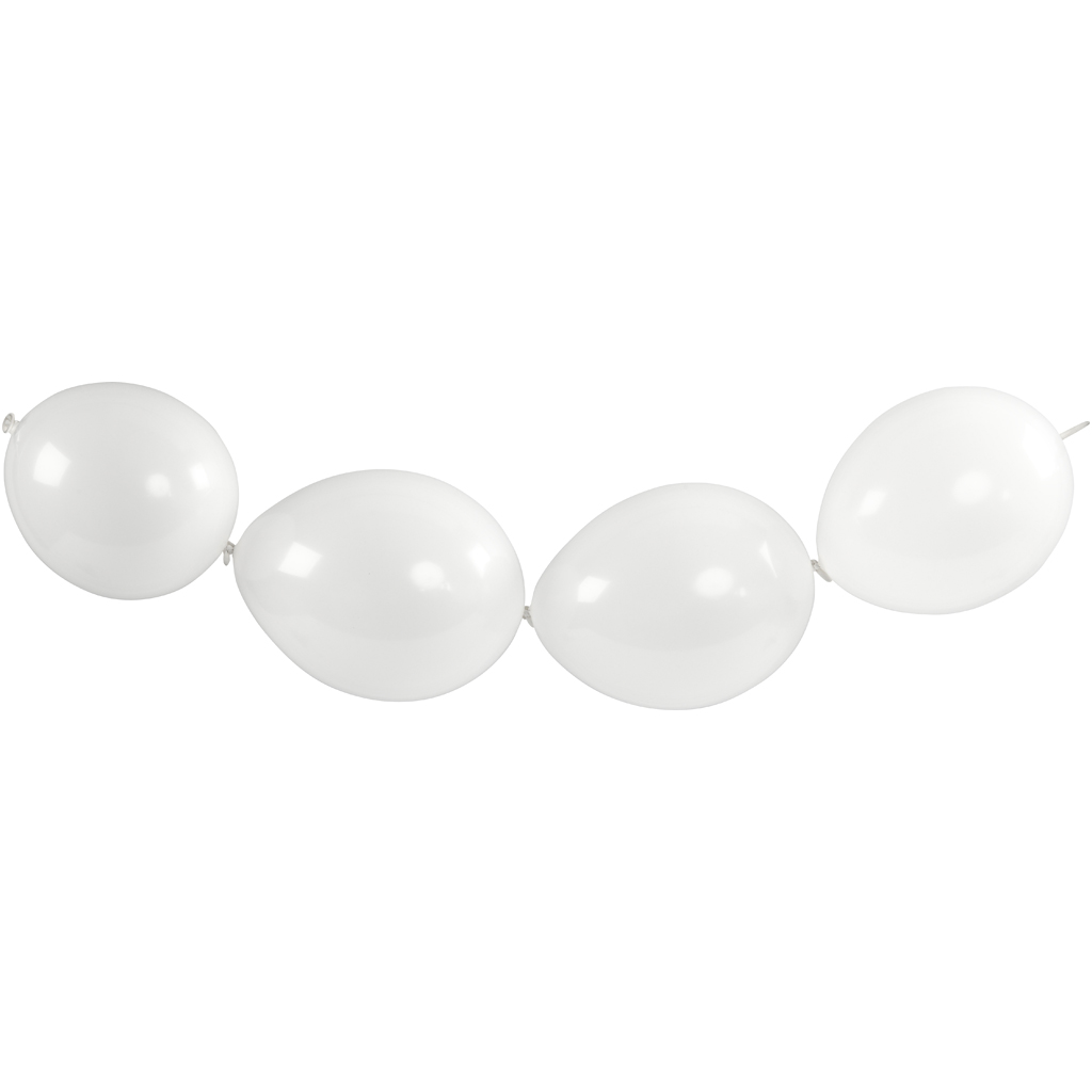Solid coloured, round balloons in natural rubber. Each one has an elongation at the opposite end of the nozzle to connect with other inflated balloons, creating a chain. Balloons, white, linked balloons, 8 pc/ 1 pack