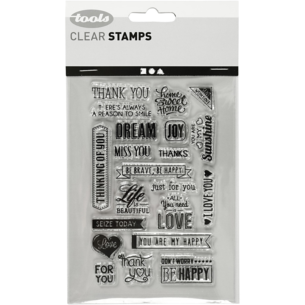 Sheets with different motives of transparent silicone. Mounted on acrylic block (item no. 21586, 21587 or 21588) and used as a stamp. Clear Stamps, English words, 11x15,5 cm, 1 sheet
