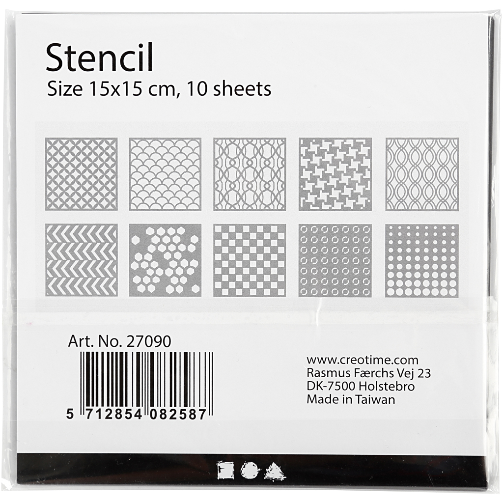 Plastic templates with pattern. Wash immediately after use with lukewarm water. Content: 10 different desingns. Stencil, size 15x15 cm, thickness 0,31 mm, 10 sheet/ 1 pack