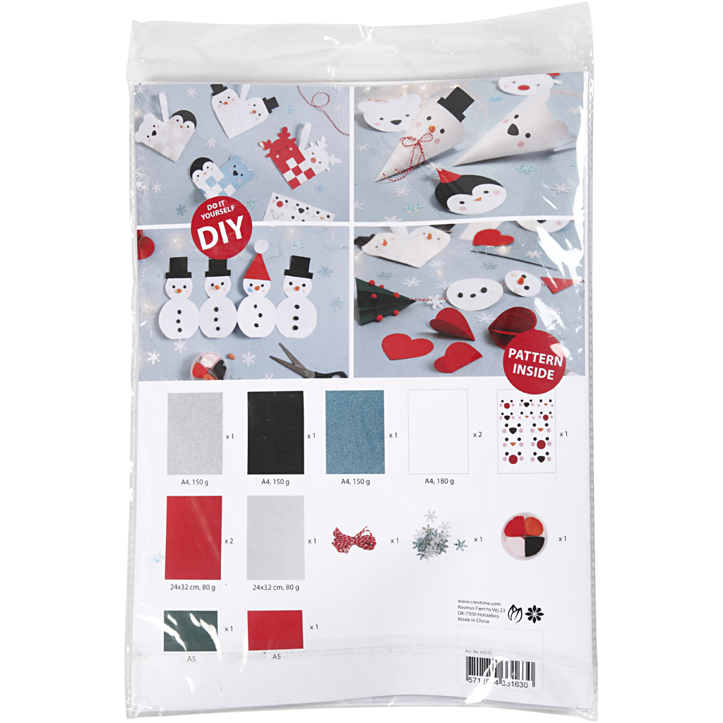 Material kit with many different creative materials. Inspiration and guidance included. Contents: Three colours of glitter paper, red and white cotton string for suspension, Silk Clay and cardboard in different colours, white and red glossy paper, stickers with eyes and noses, and 10g sequins. Christmas decoration, 1 set