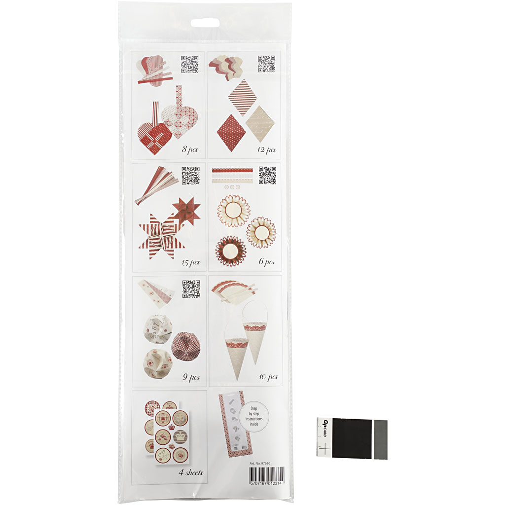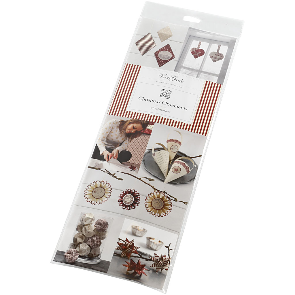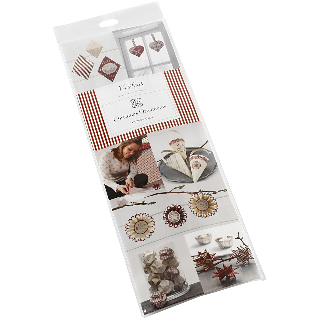 Material kit for beautiful Christmas decorations from the Vivi Gade Design series. Total 66 different ornaments. Guide lines included. Contains material for: 8 assorted braided hearts, 15 assorted stars, 10 assorted cones, 6 assorted rosettes, 9 assorted click ornaments, 12 assorted diamond ornaments and 4 assorted sheets of stickers for decoration. Christmas Ornaments, 1 pack