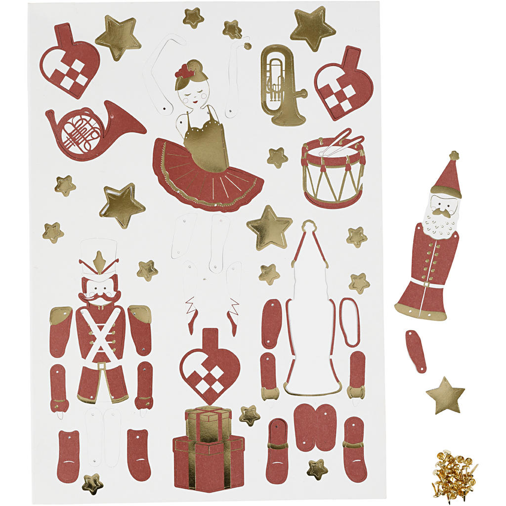 Decorative motifs in several sizes of punched-out cardboard with matt surface in Vivi Gade design. The main figures are easily assembled with enclosed clips to small jumping jacks. For hanging, decorating on cards and gift wrapping etc. Content: 2 sheets each with 3 figures and small die cuts- a total of 50 pieces. Jumping jacks, gold, red, white, H: 10-165 mm, 300 g, 2 sheet/ 1 pack