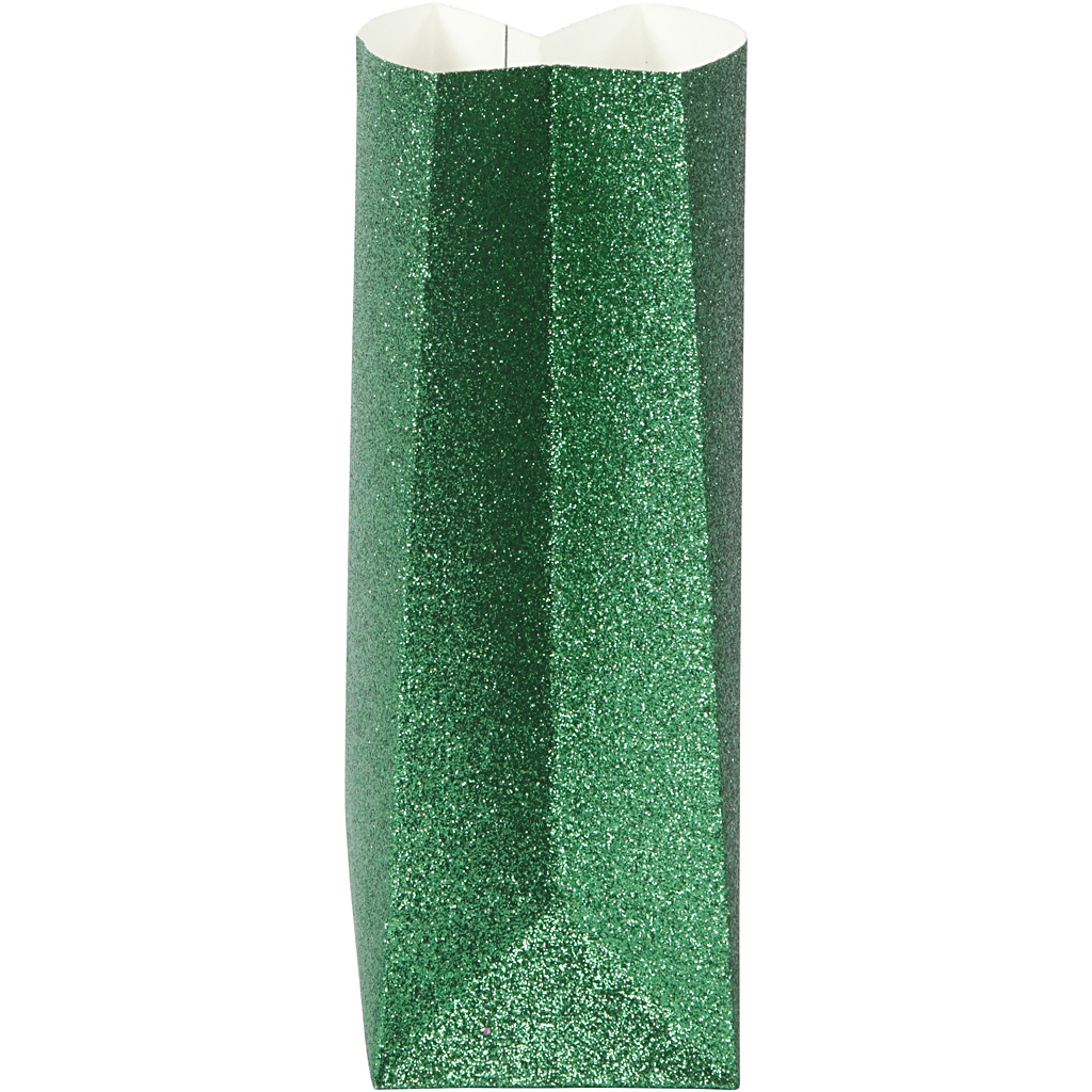 Sturdy block-bottom quality paper bag from Vivi Gade, which has glitter everywhere on the outside and a white inside. Paper Bag, green, size 6x9 cm, H: 17 cm, 150 g, 8 pc/ 1 pack