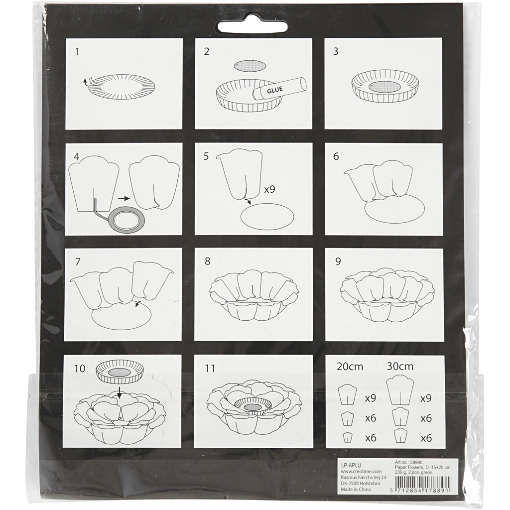 A set for 2 evenly-sized flowers, both containing different parts, stamped in structured card. Detailed instructions and double-sided tape included. Total 10 sets each in 9 different colours. Paper Flowers, green, dia. 15+25 cm, 230 g, 2 pc/ 1 pack