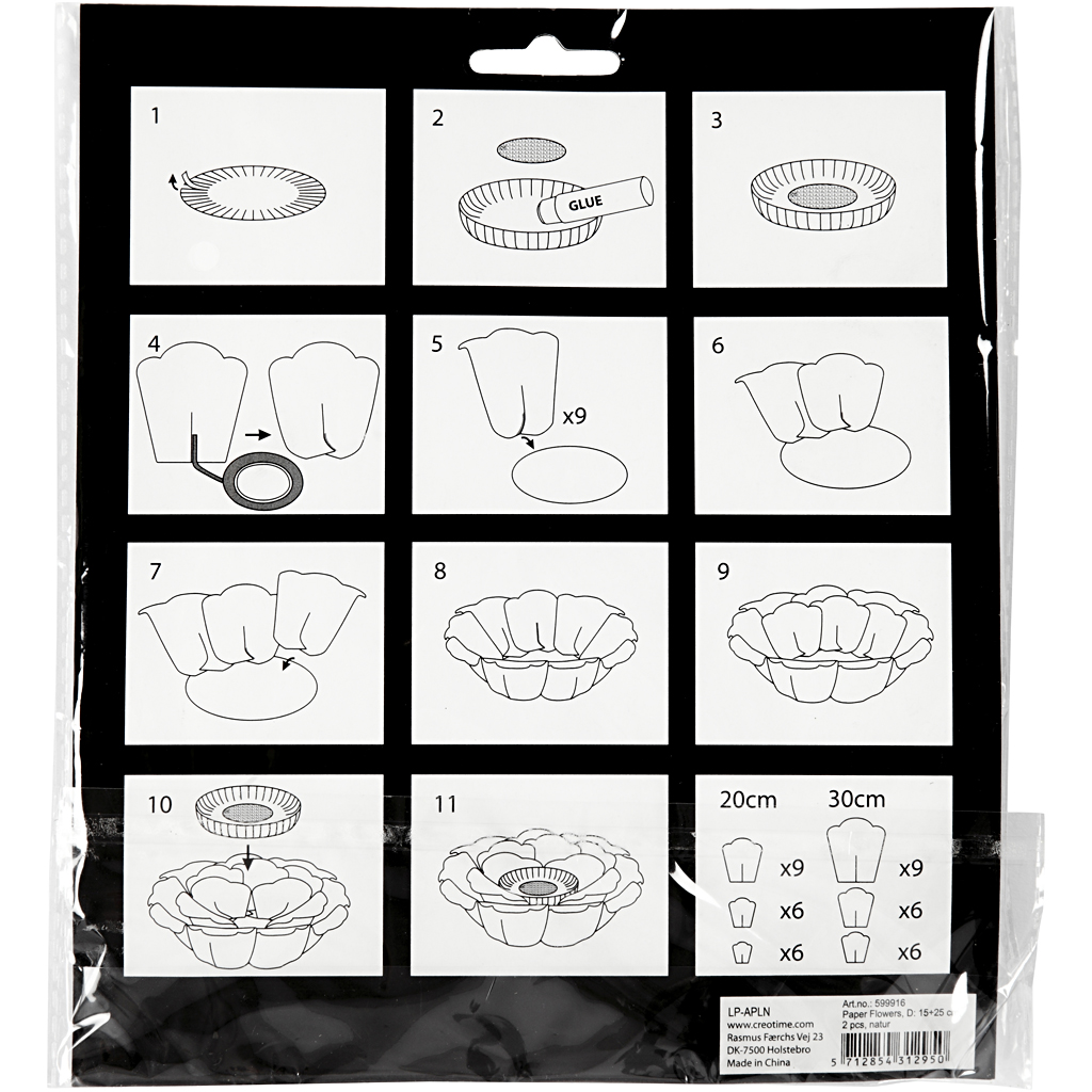 A set for 2 evenly-sized flowers, both containing different parts, stamped in structured card. Detailed instructions and double-sided tape included. Total 10 sets each in 9 different colours. Paper Flowers, natural, dia. 15+25 cm, 2 pc/ 1 pack