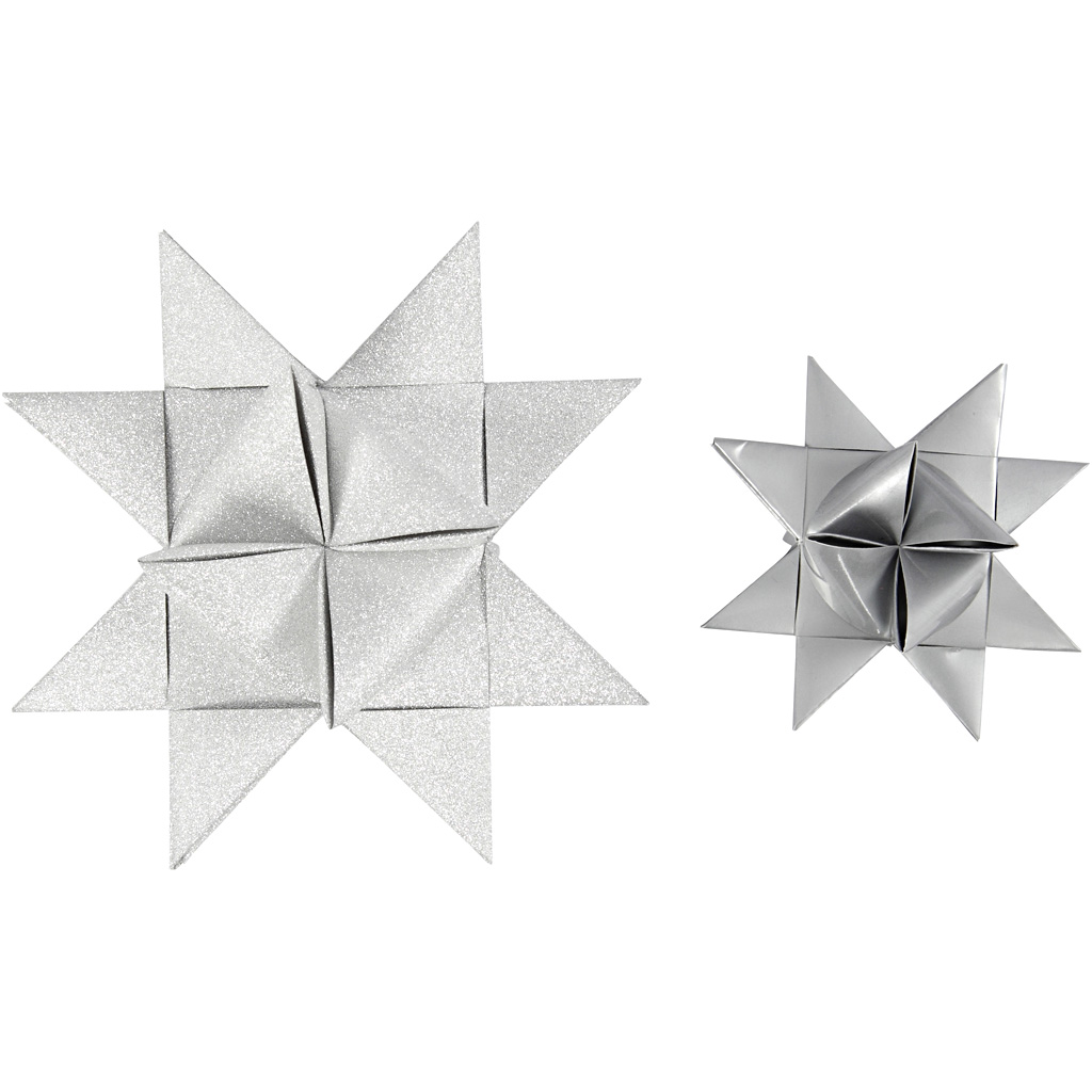 One-coloured paper star strips in two different sizes from the Vivi Gade Design series. Diameter indicates the star's final size. Instructions included. Pack with 16 pcs. with glitter surface and 24 pcs. with lacquered surface. Paper Star Strips, silver, L: 44+78 cm, D 6,5+11,5 cm, W: 15+25 mm, glitter,varnish, 40 strips/ 1 pack