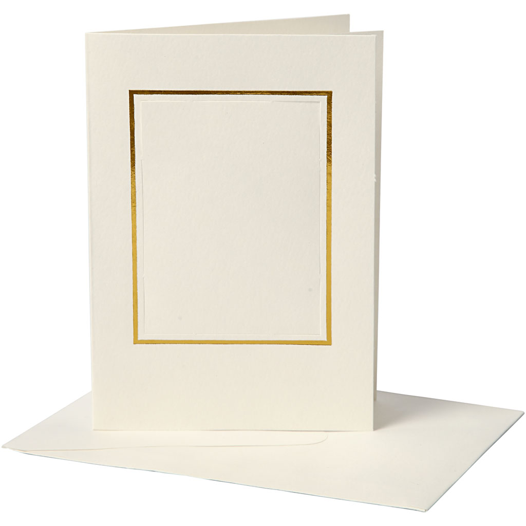 Double blank cards (220g), embossed with a beautiful hammer finish, aperture with gold fame, envelope and backside for passepartout included. 220 g. Passepartout Card, off-white, rectangular with gold border, card size 10,5x15 cm, envelope size 11,5x16,5 cm, 10 set/ 1 pack