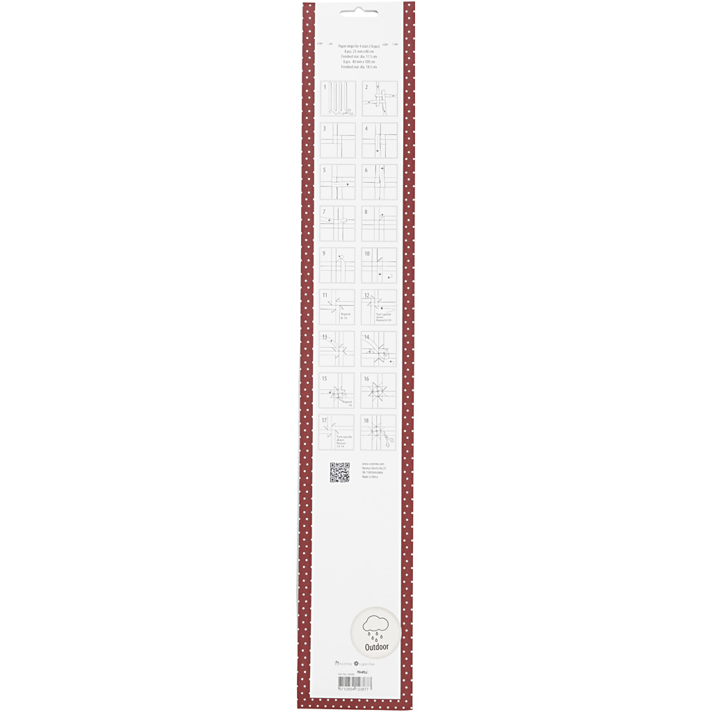 Glossy foil strips for braiding stars in two sizes from Vivi Gade. The foil is weather-resistant so finished stars can be hung outside. Diameter indicates the finished star's two sizes. Instruction included. Pack of 16 strips for a total of 4 stars i. Star Strips, red, red glitter, L: 86+100 cm, W: 25+40 mm, dia. 11,5+18,5 cm, 16 strips/ 1 pack
