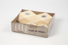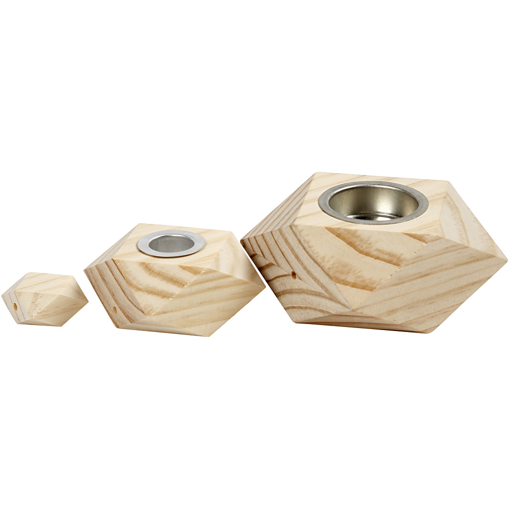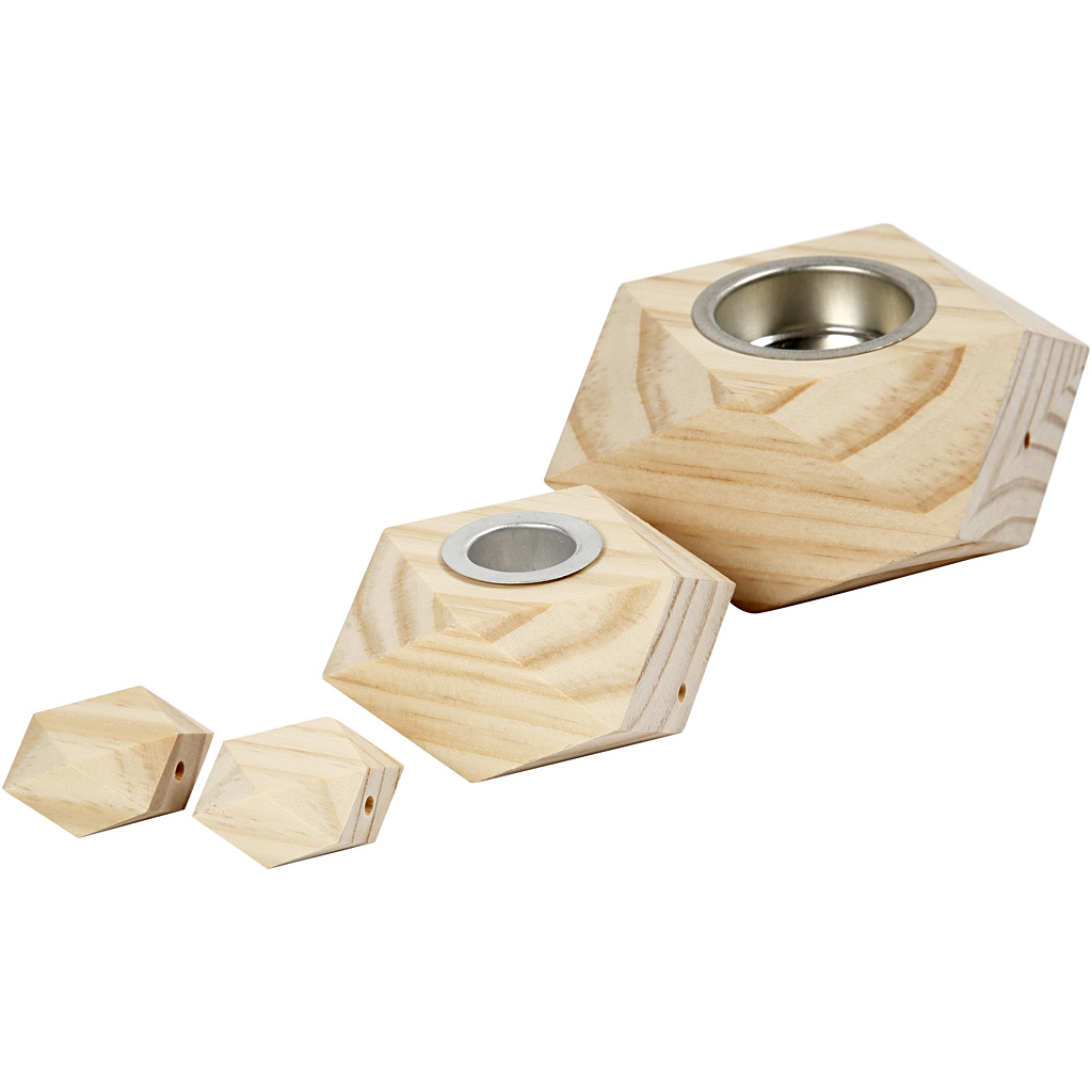 Set of 2 different sized candle holders. Each of with 2 pcs. and 4 pcs. big light wooden beads (3cm) . A total of 8 parts with a hole (4 mm) drill through for mounting on leather cord. The biggest candle holder has a hole for a tea light candle on one side and a hole for a candle stick at the other side. The small candle holder has a hole for a candle stick. Candle Holders, H: 3,4+5 cm, D 6,2+9 cm, hole size 2,2+4,2 cm, 1 set
