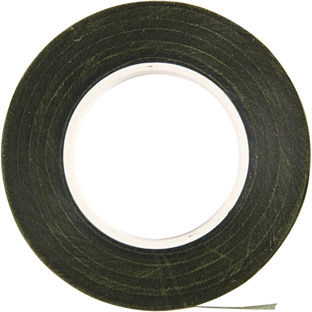 Thin waxed paper tape that sticks to itself, by heating with hands. Can be used to decorate round objects, due to high flexibility. Floral Tape, dark green, W: 12 mm, 27 m/ 1 roll