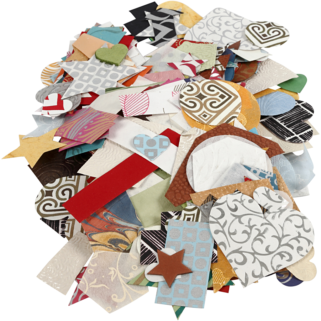 Assortment of punched shapes and figures in exclusive handmade cotton paper with metallic print, embossing etc. Content may vary. Designed for decoration on cards, scrapbooking, collages etc. Handmade Paper Die-Cut, size 25-130 mm, 110-150 g, 100 g/ 1 pack