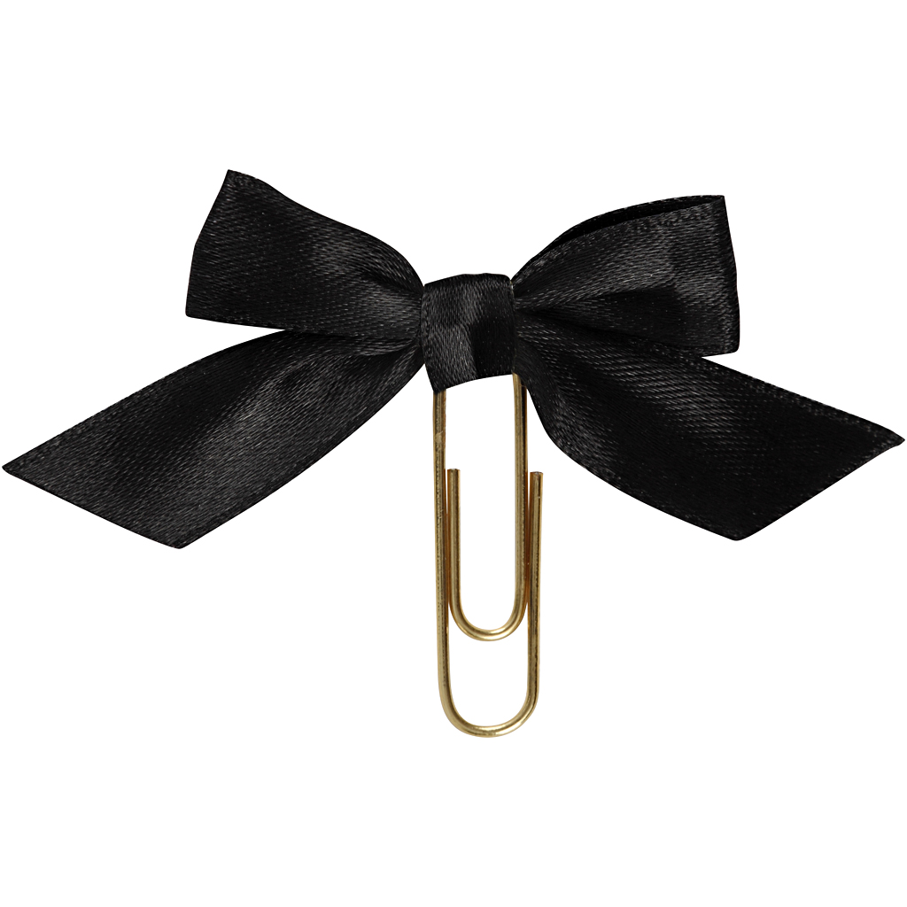 Gold plated metal clip with on-band bow of satin ribbon. Used as decoration and effect on cards, invitations, gifts, scrapbooking, planner and much more. Metal Paperclips, black, size 40x70 mm, 5 pc/ 1 pack
