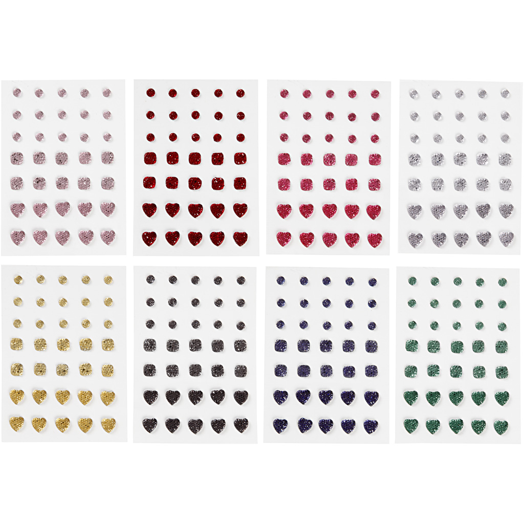 An assortment of self-adhesive rhinestones in a design from Vivi Gade with a raise front and a flat back on sheets in 3 designs (round, square, heart). Rhinestones, assorted colours, round, square, heart, size 6+8+10 mm, 8x10 pack/ 1 pack