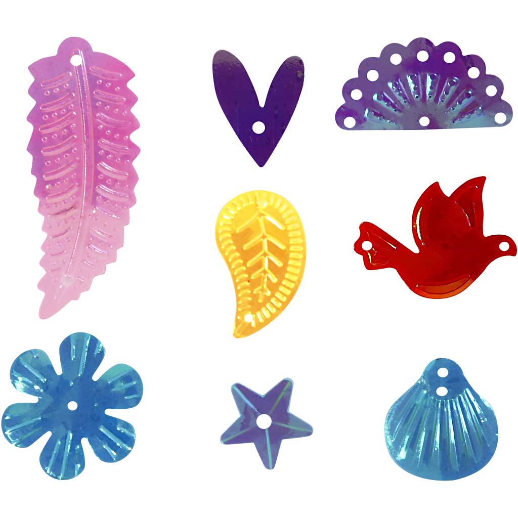 Assortment of sequins in various shapes and colours. Sequins, mother of pearl colours, size 15-45 mm, 30 g/ 1 pack